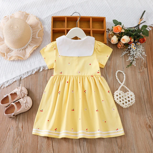 فستان صيفي للفتيات الصغيرات بأكمام قصيرة وياقة مقلوبة ملابس قطنية للفتيات من سن 2 إلى 6 سنوات فساتين أطفال