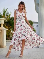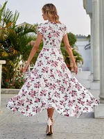 فستان نسائي أنيق متوسط الطول على شكل زهرة موضة الصيف الجديدة بياقة واقفة وأكمام طائرة وأربطة فستان كاجوال لقضاء عطلة الشاطئ