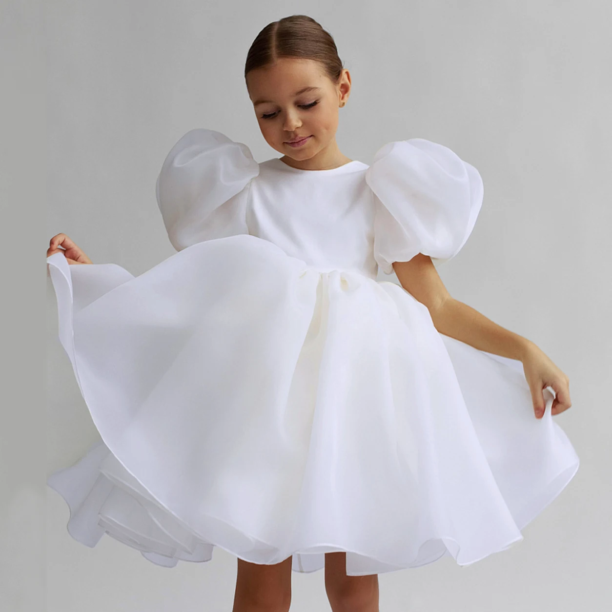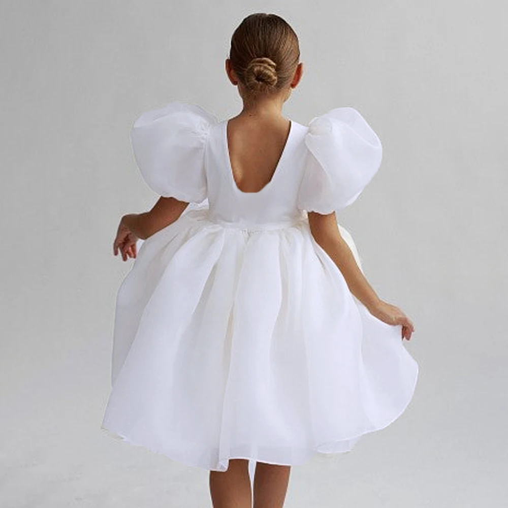 أزياء بيضاء وصيفات الشرف حزب الفتيات فساتين نفخة الأكمام الزفاف زي عيد ميلاد الأميرة حفلة موسيقية اللباس فتاة أول بالتواصل ثوب