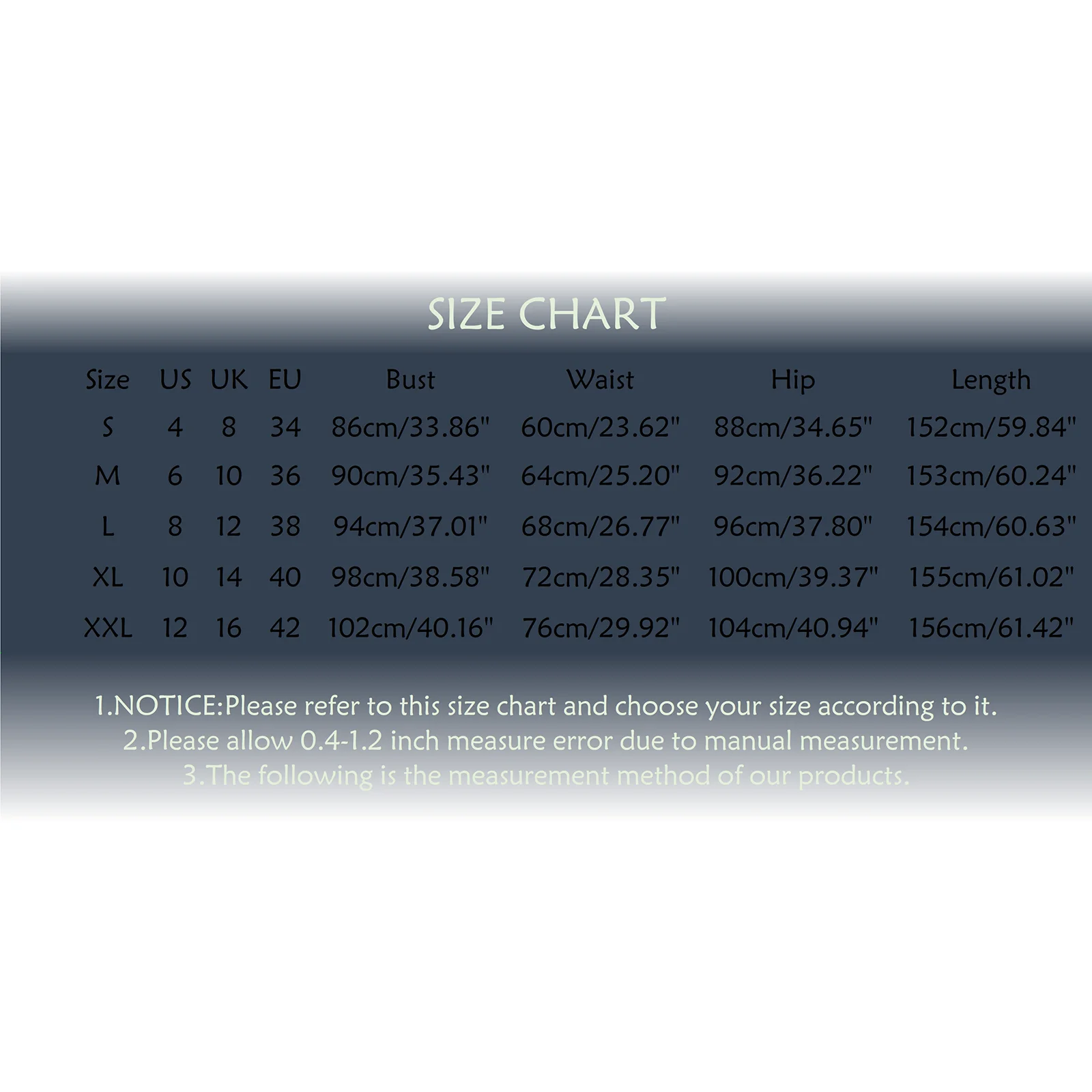 | Size:XL | US:10 | UK:14 | EU:40 | Bust:98cm/38.58” | Waist:72cm/28.35” | Hip:100cm/39.37” | Length:155cm/61.02” |
