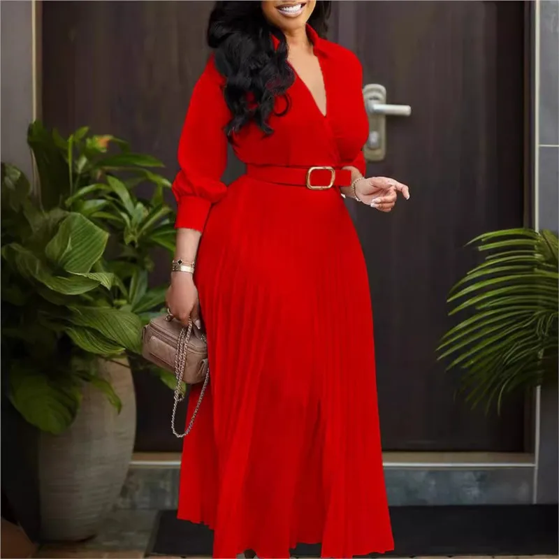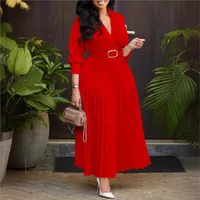 الخريف المرأة مطوي الخامس الرقبة طويلة الأكمام حزام ميدي فستان أنيق كم طويل حزام أحمر أبيض فساتين الحفلات المسائية رداء مثير Femne