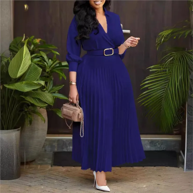 فستان نسائي أنيق برقبة شكل V ، كم بتلات ، لون سادة ، مطوي ، ملابس عمل ، صيف