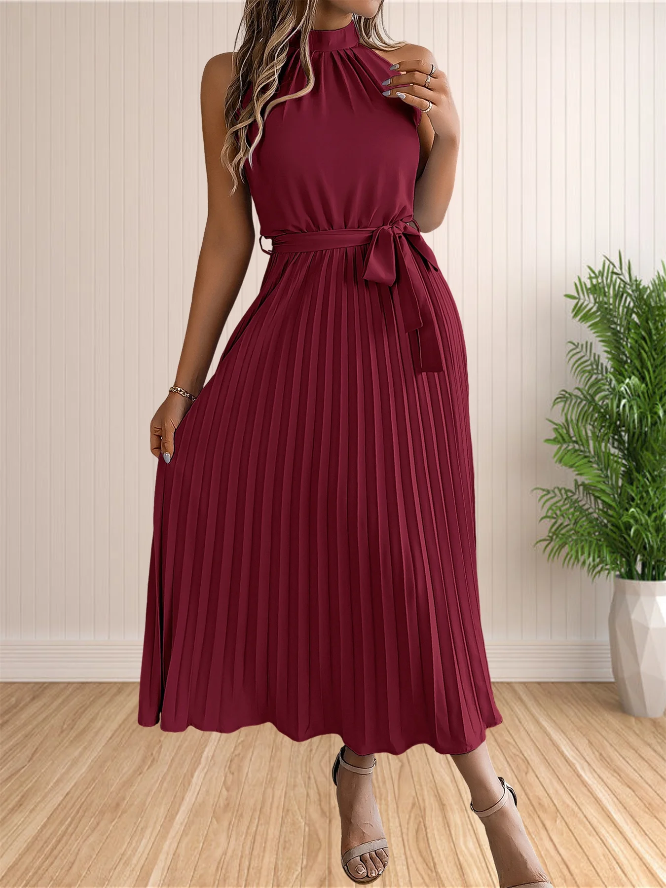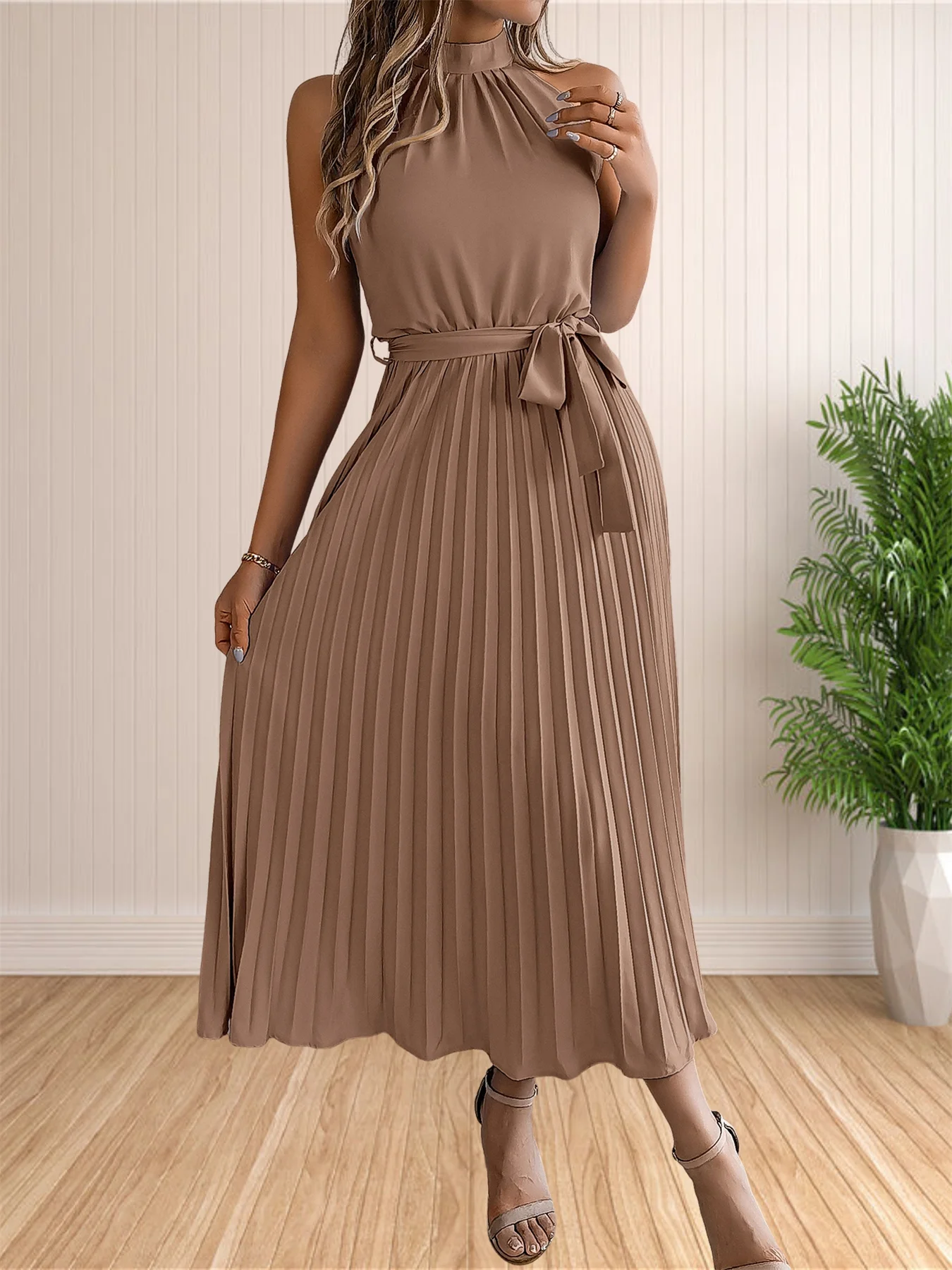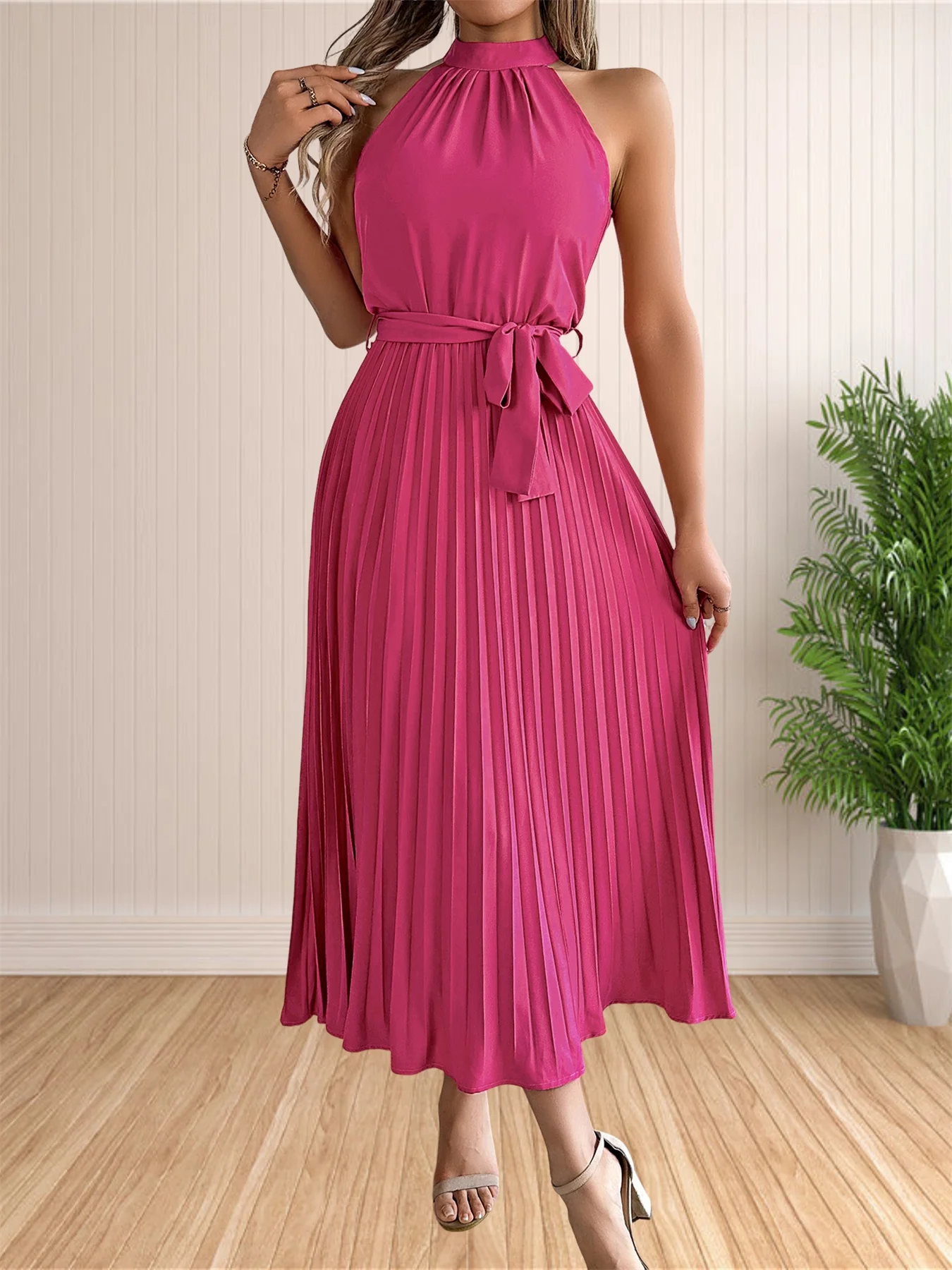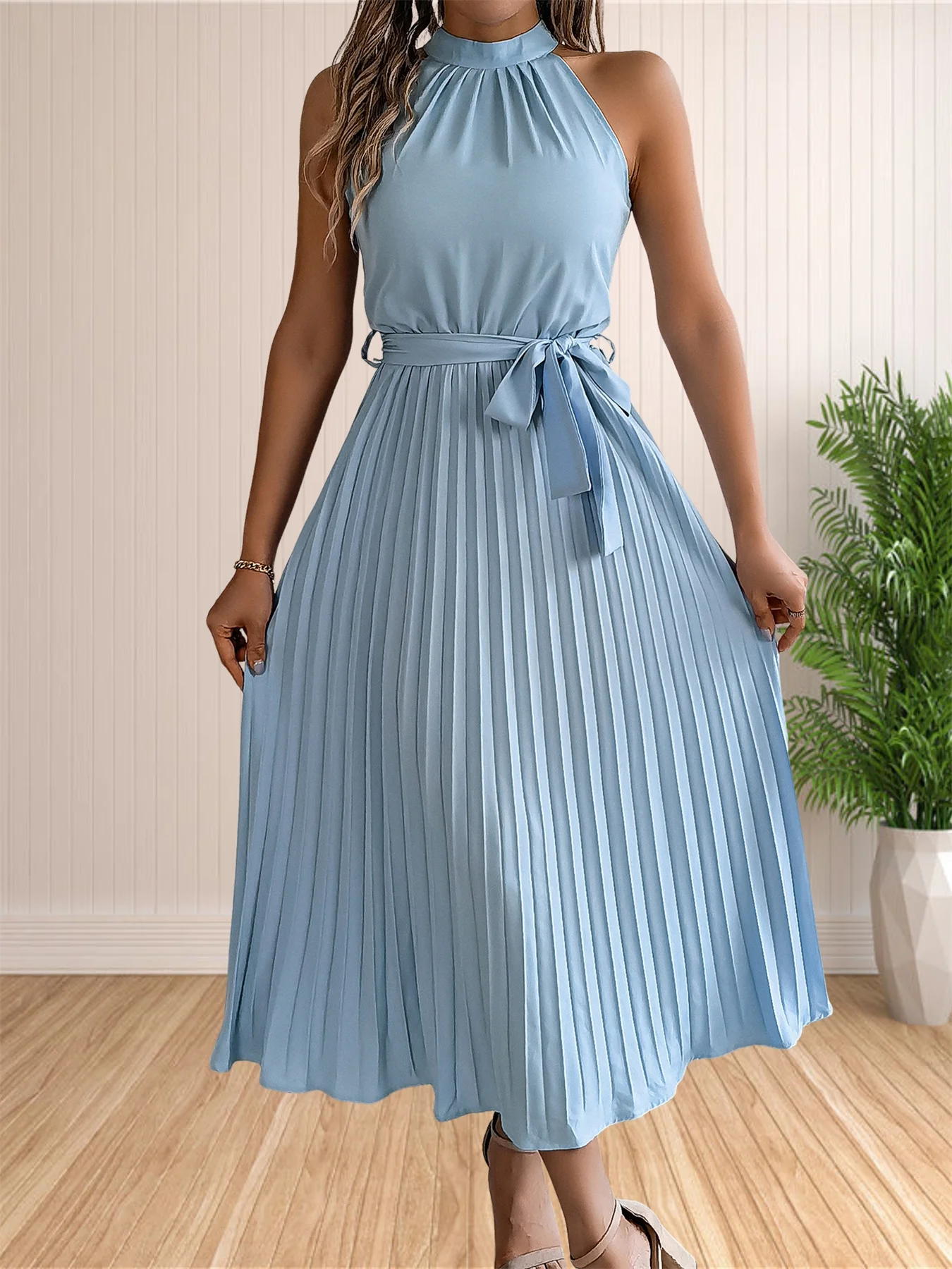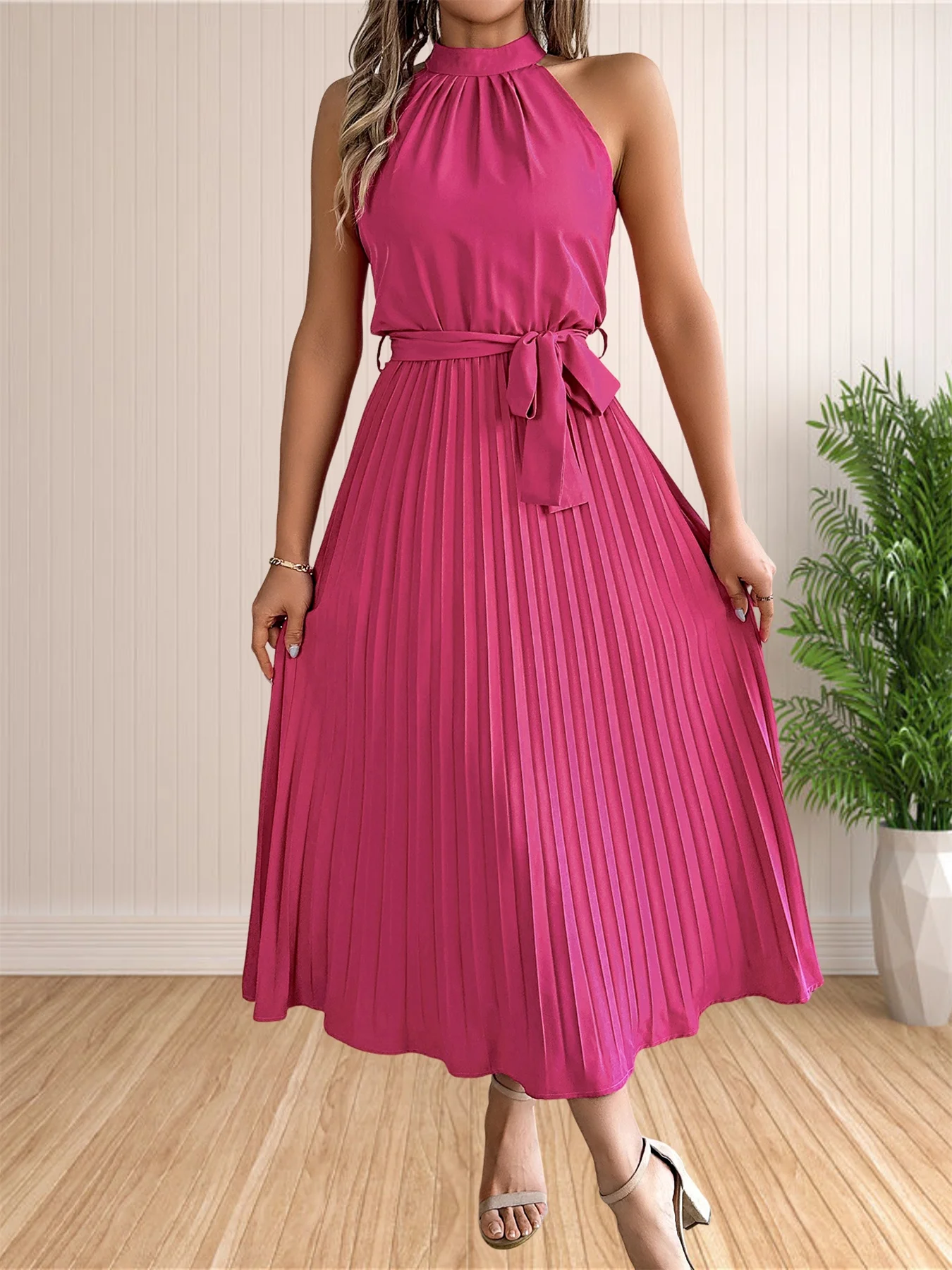 المرأة 2024 الصيف بلا أكمام الرسن الرقبة مطوي ميدي فساتين لحفلات الكوكتيل خط فلوي شاطئ فستان الشمس مع حزام