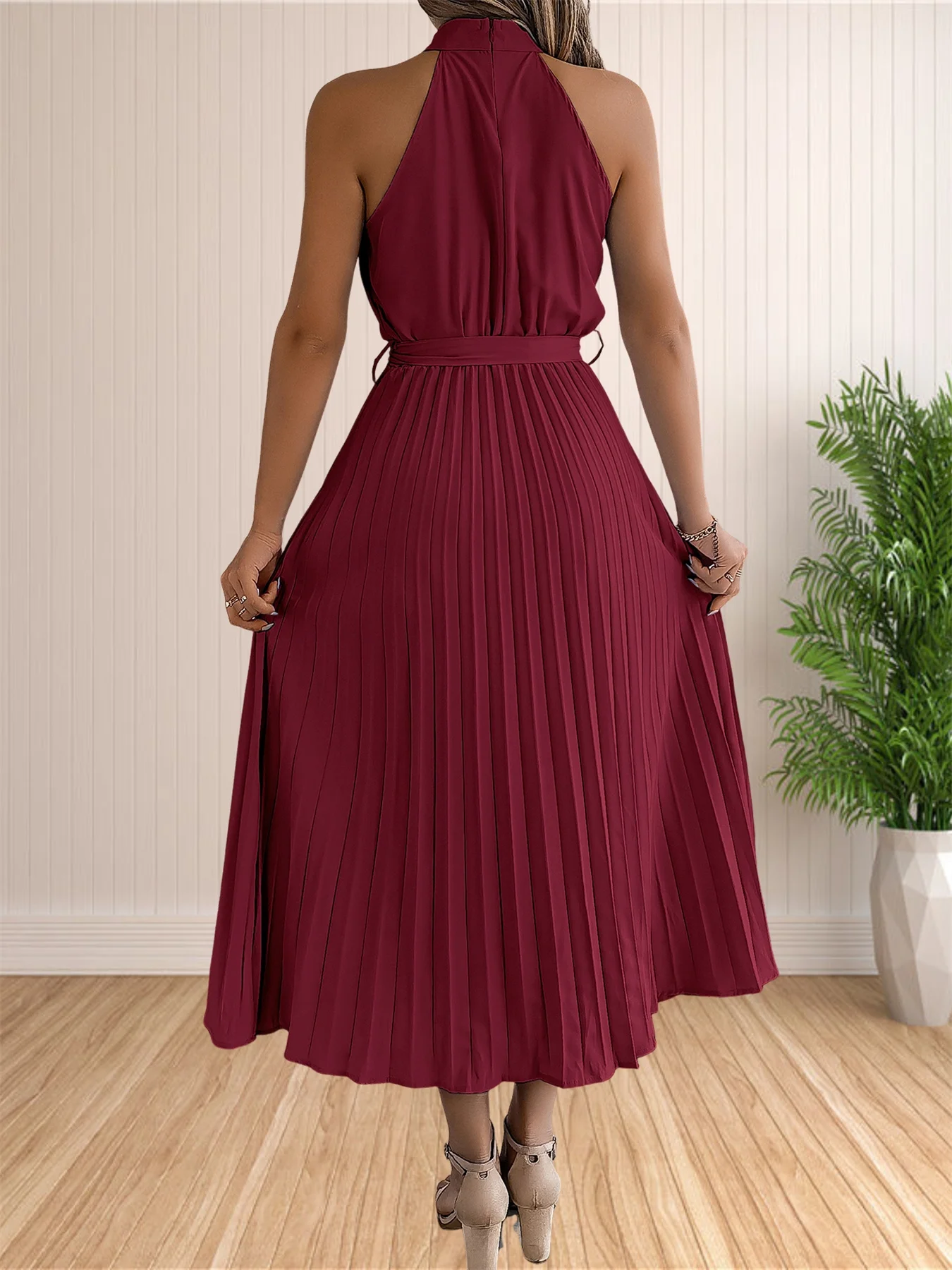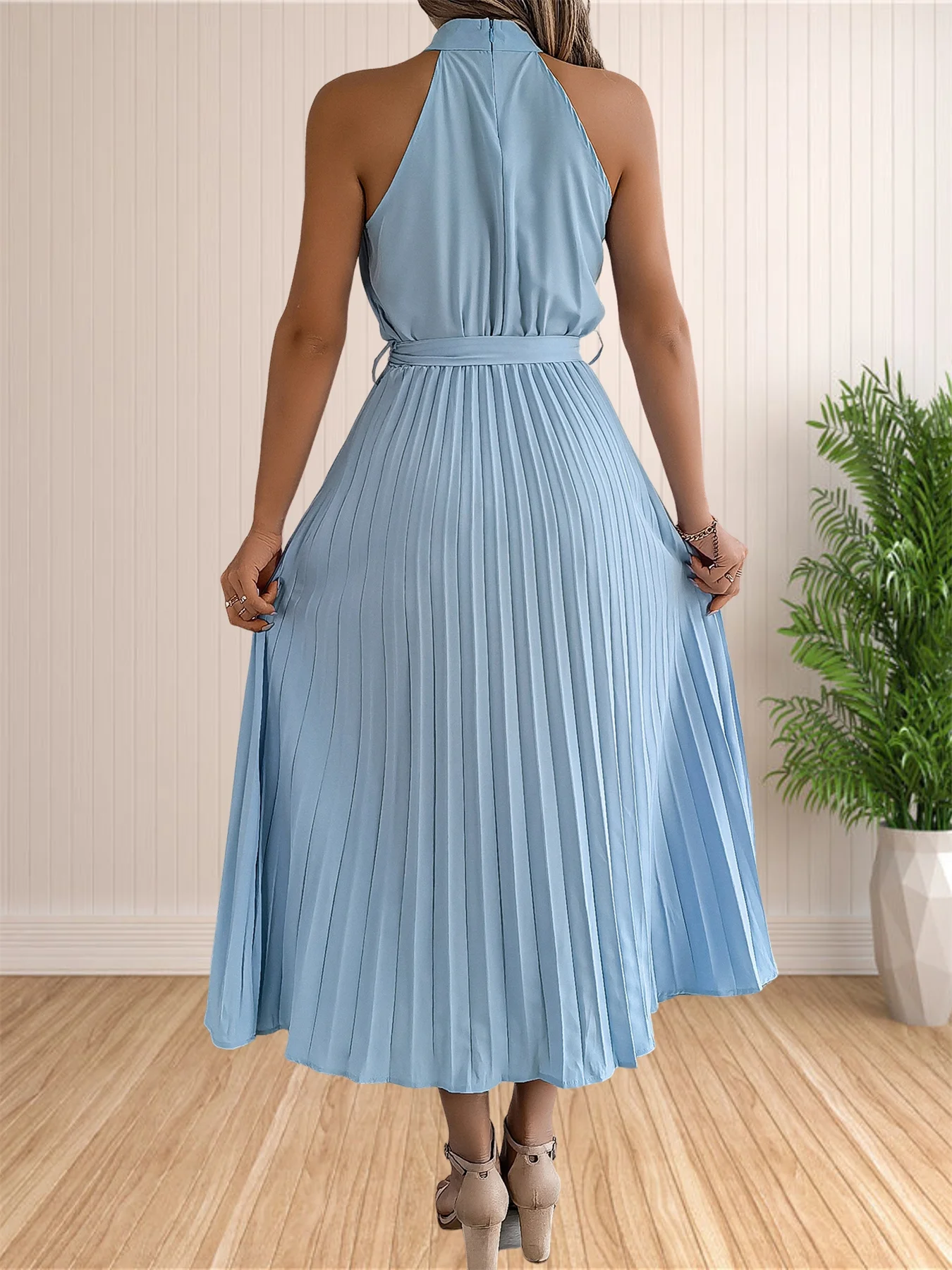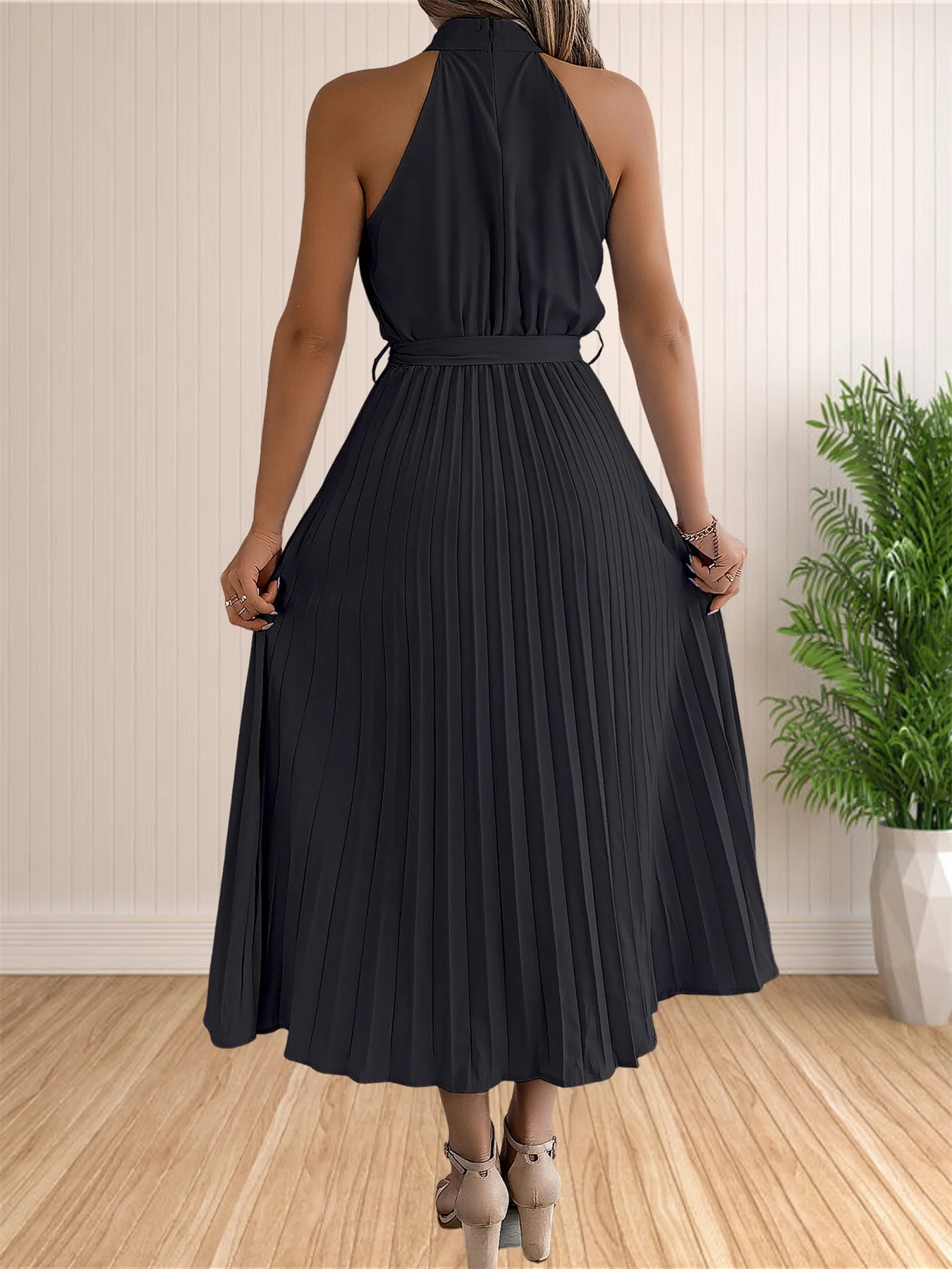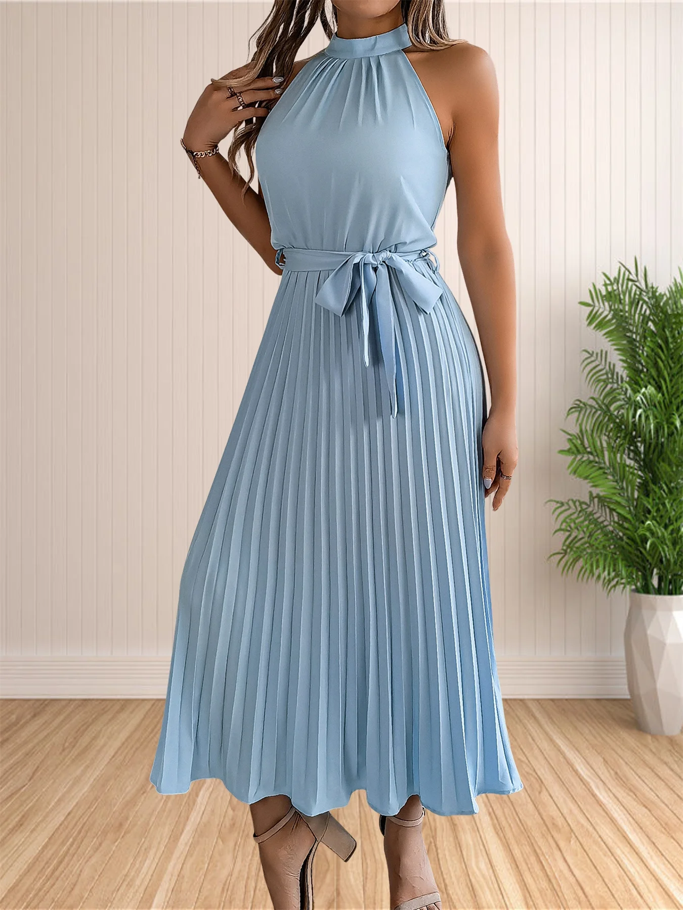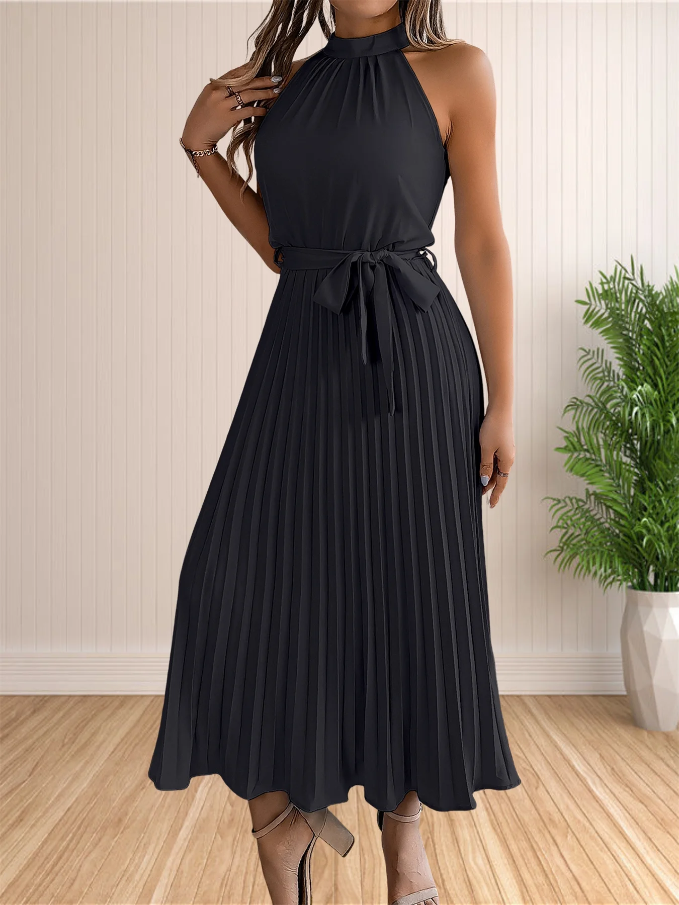 المرأة 2024 الصيف بلا أكمام الرسن الرقبة مطوي ميدي فساتين لحفلات الكوكتيل خط فلوي شاطئ فستان الشمس مع حزام