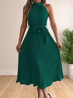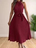 المرأة 2024 الصيف بلا أكمام الرسن الرقبة مطوي ميدي فساتين لحفلات الكوكتيل خط فلوي شاطئ فستان الشمس مع حزام