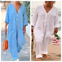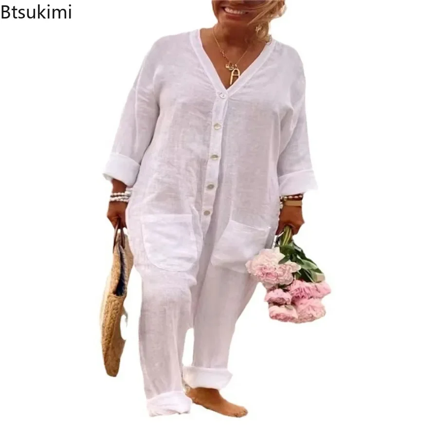 بدلة قفز غير رسمية من القطن والكتان لعام 2025 للنساء على الموضة بياقة على شكل حرف v وأزرار متابعة وجيوب متوسطة الخصر بدلة فضفاضة للإجازات