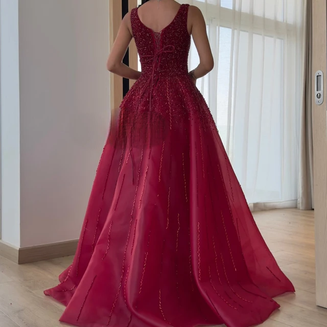 فستان سهرة فاخر بشرابة كريستال 2025 فساتين رسمية بدون حمالات للحفلات الراقصة بفتحة خلفية وأربطة من الخلف بدون أكمام للحفلات