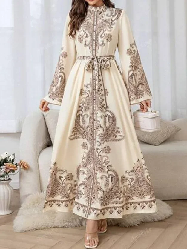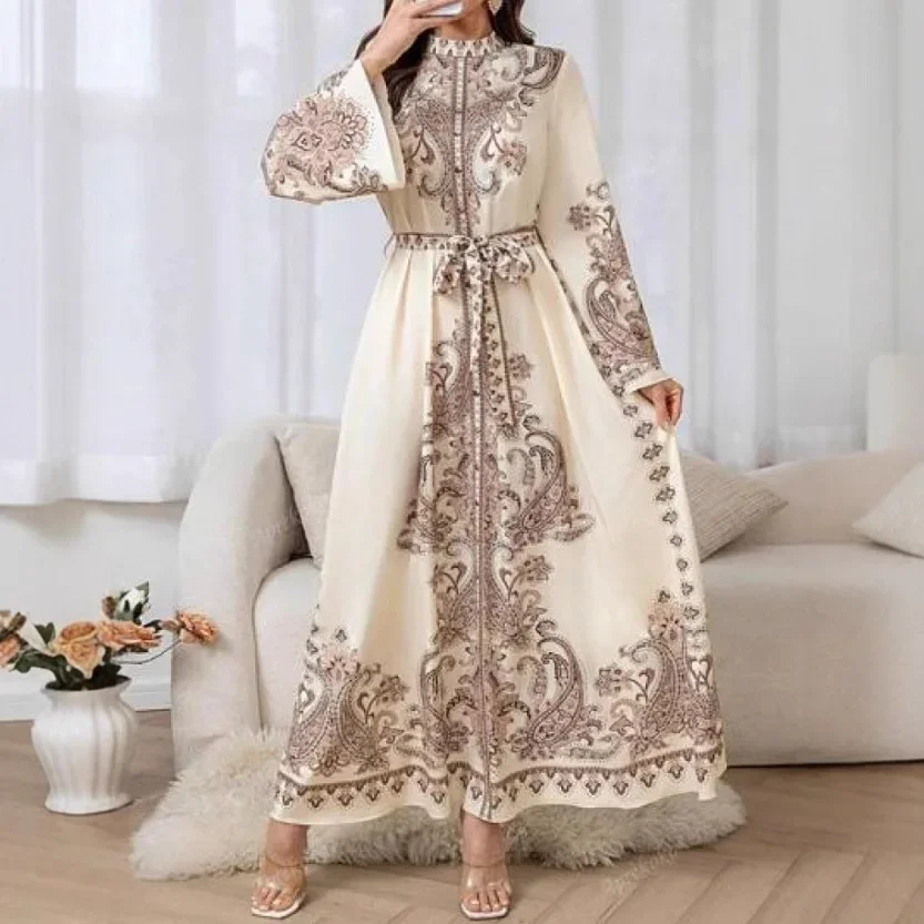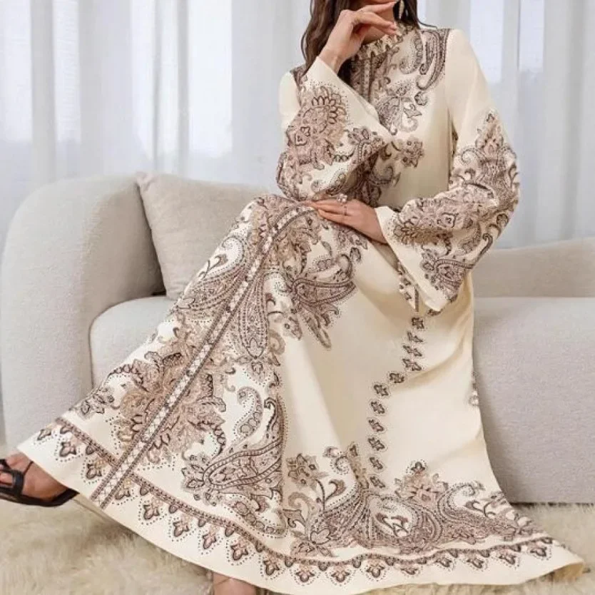 جديد وصول طويل فانوس كم موجة حافة طباعة اللباس الوقوف طوق الملابس النسائية الإسلامية خمر نمط فستان ماكسي