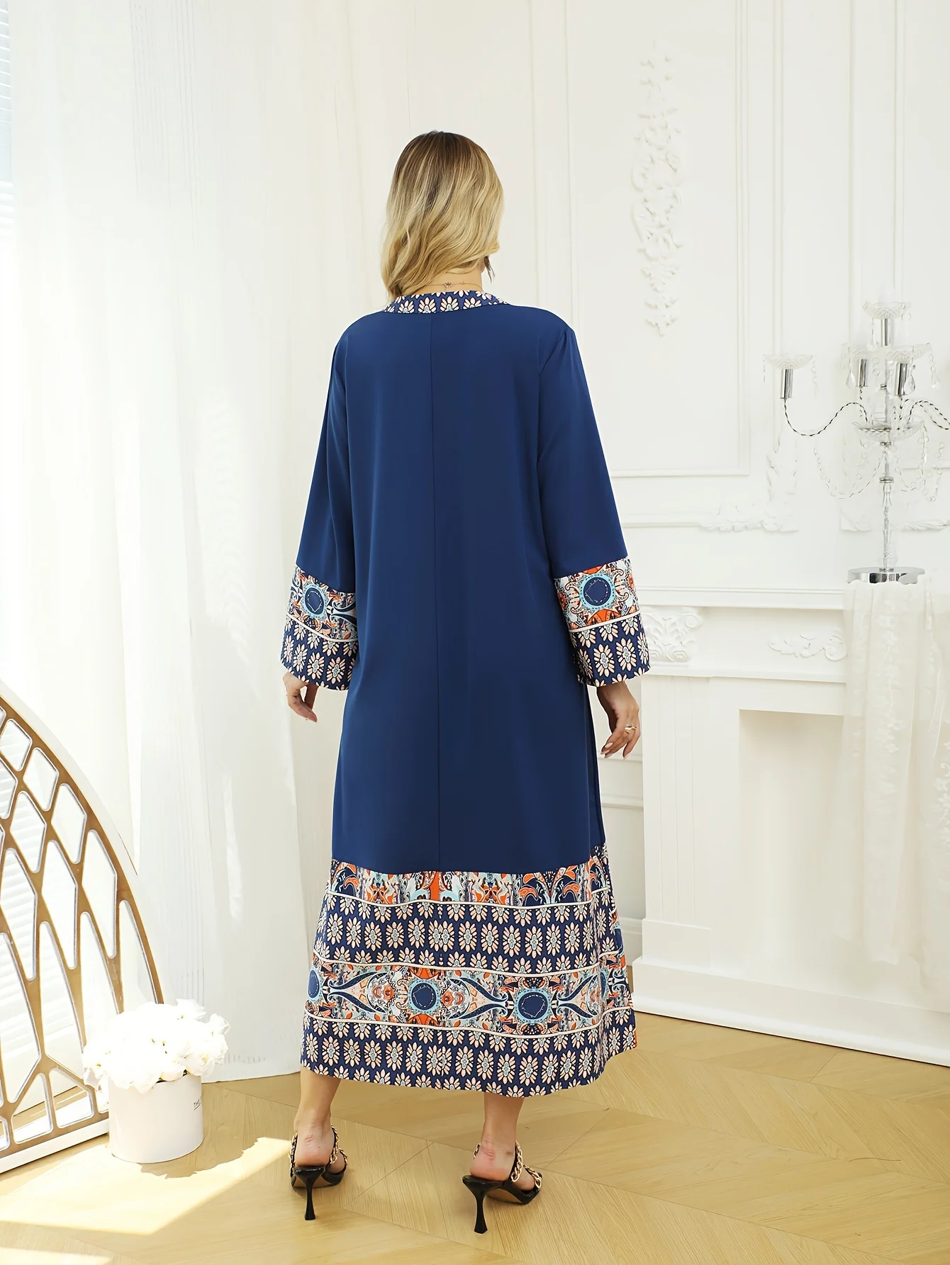 عباية إسلامية أنيقة ملفوفة – أنماط فارسية ونابضة بالحياة، أزرق بأكمام طويلة، ألياف بوليستر