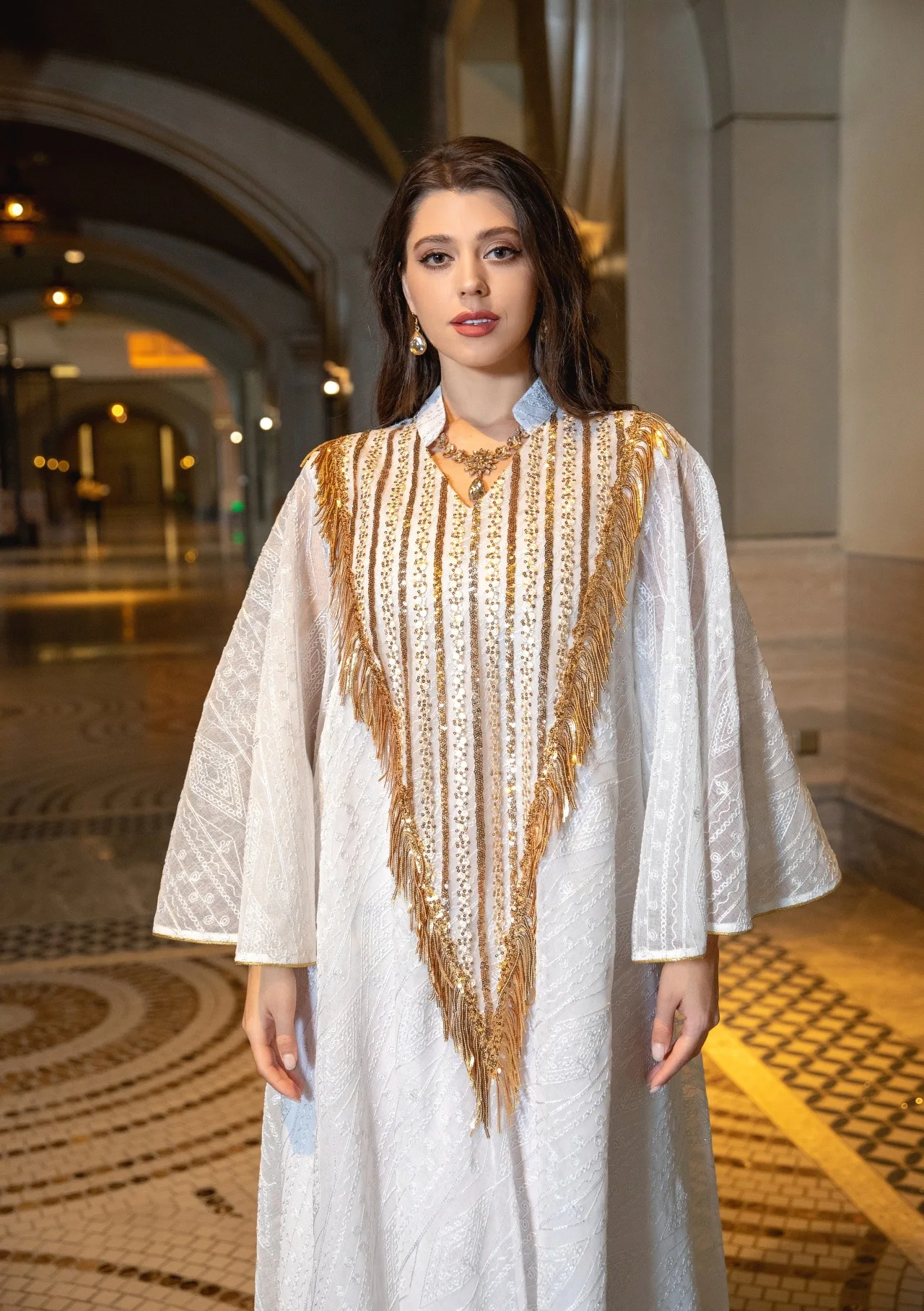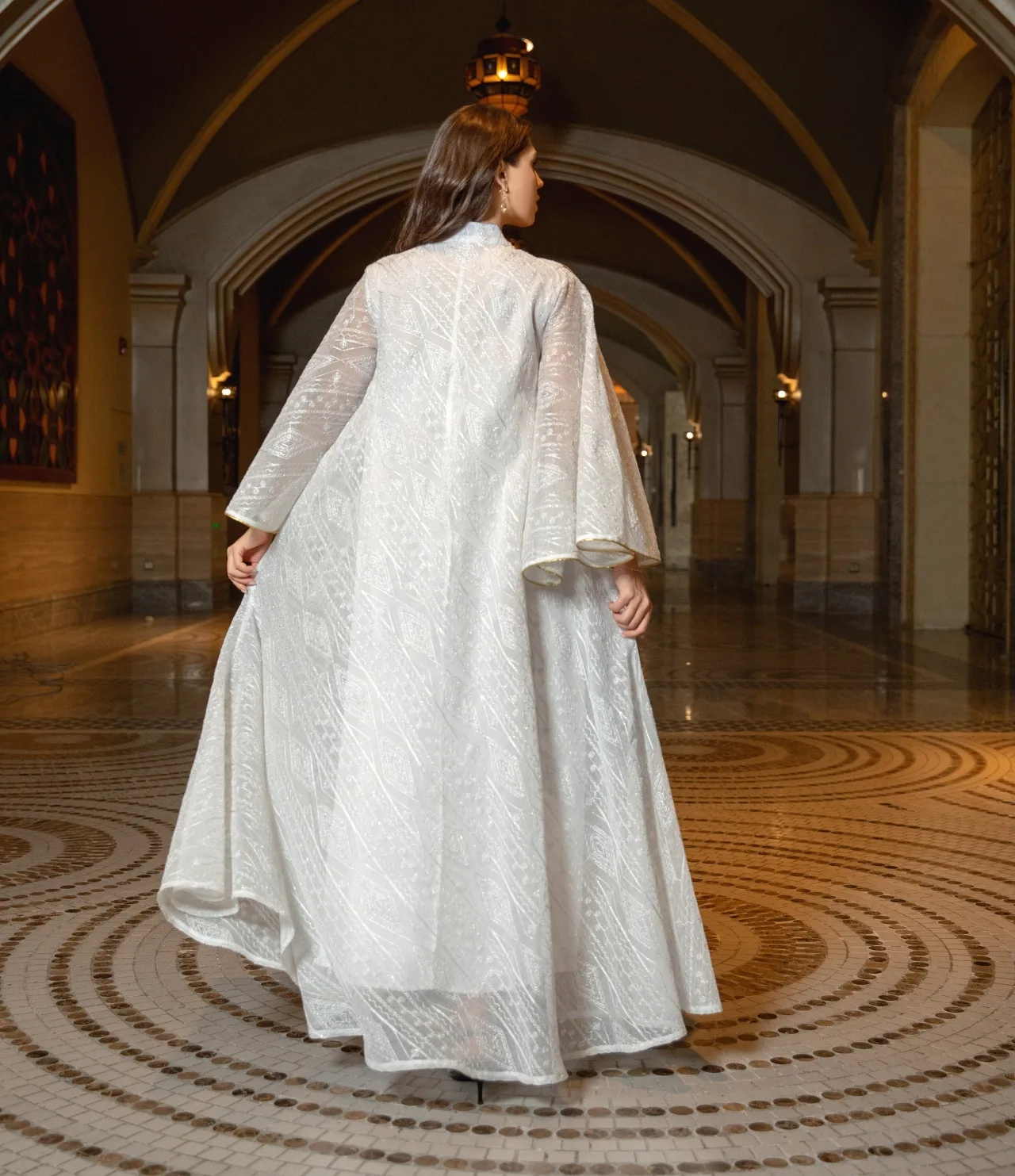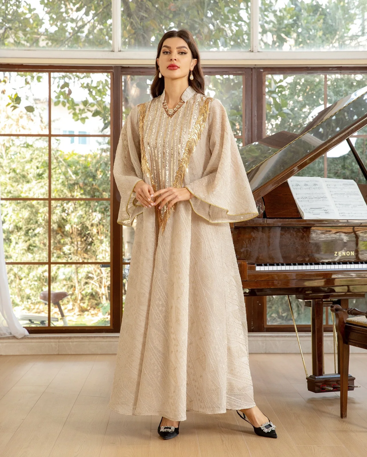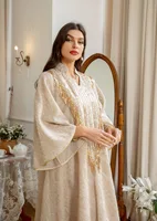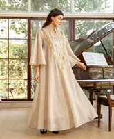 عباية إسلامية فاخرة مزخرفة باللون البيج تتميز بتفاصيل مطرزة بالذهب المزخرف للمناسبات الاجتماعية في الشرق الأوسط المتطورة