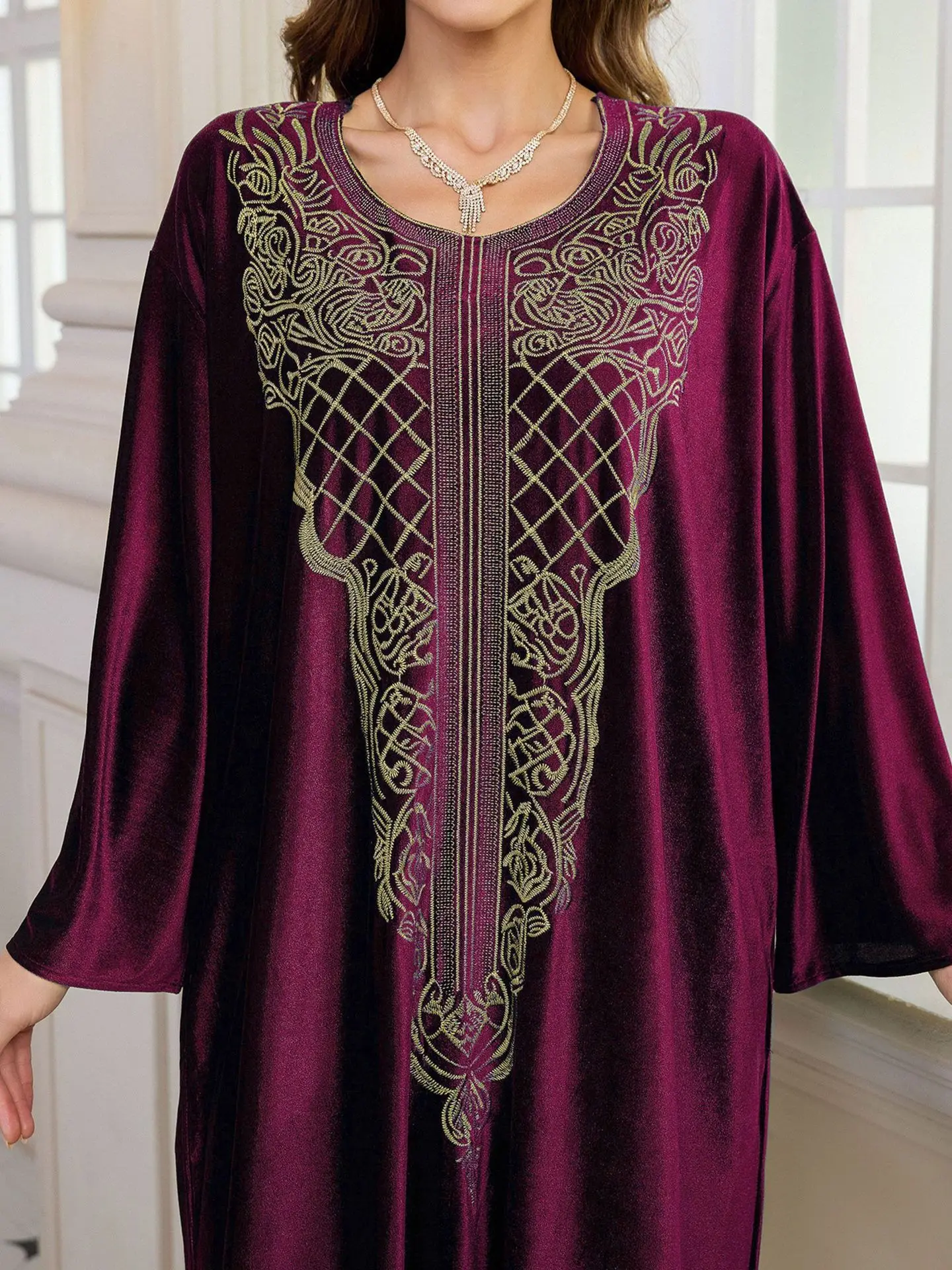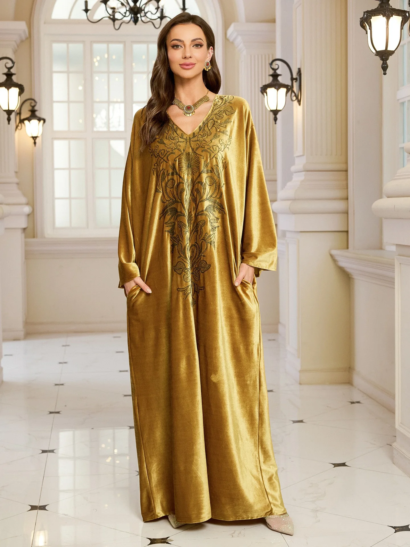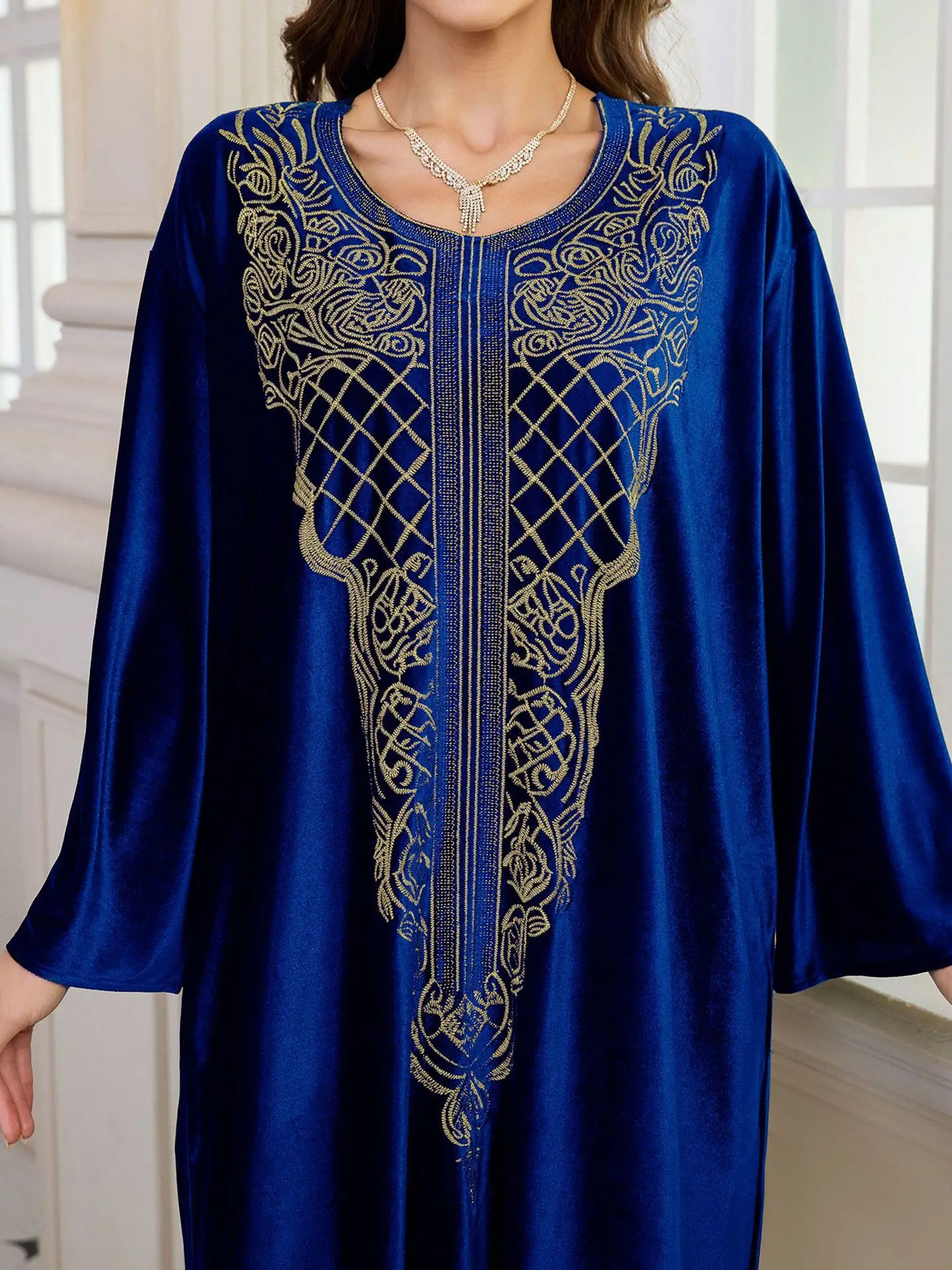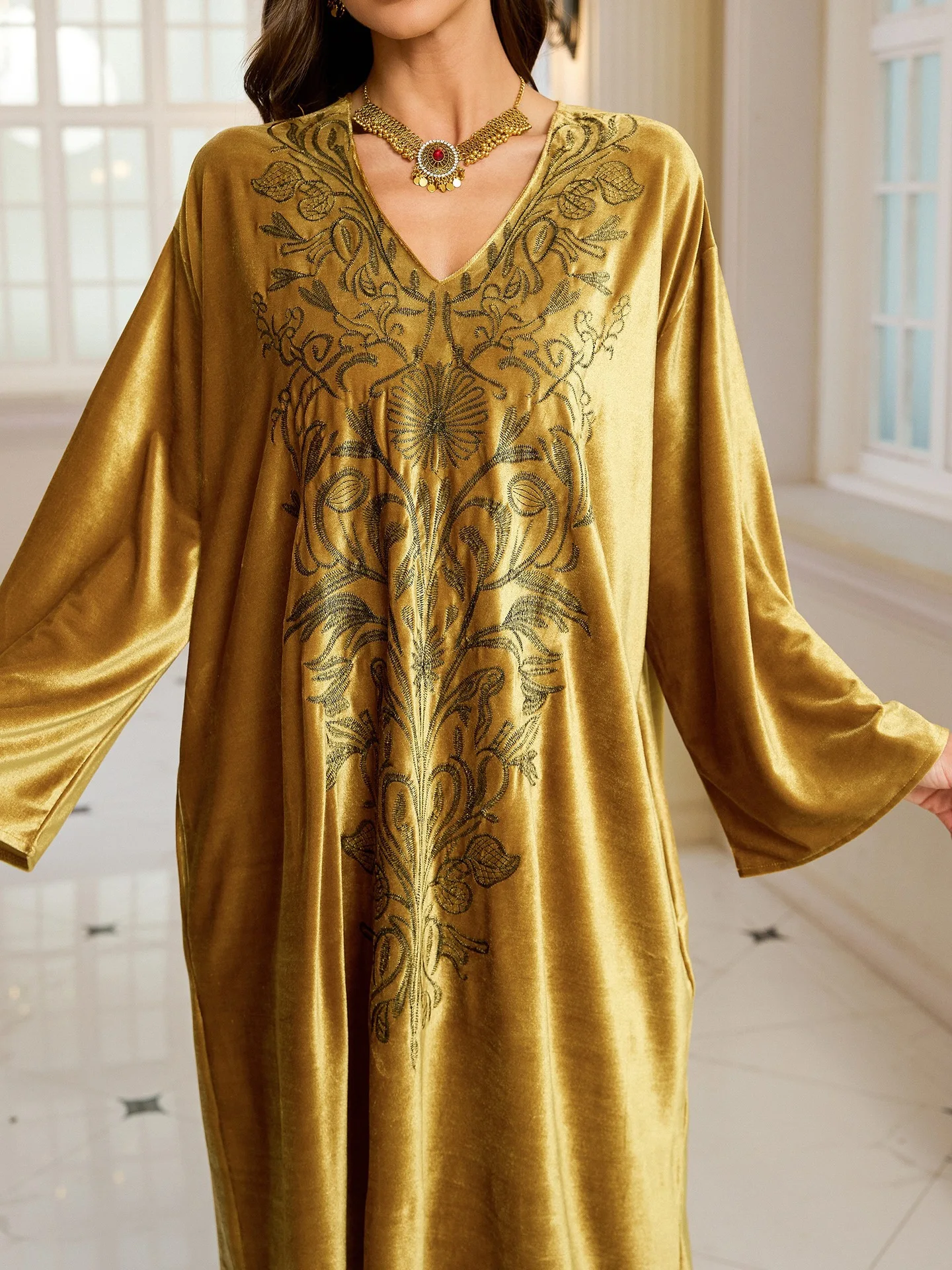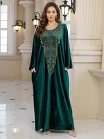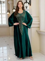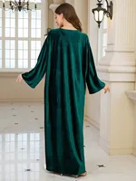 فستان قفطان مطرز فاخر للنساء، فستان جلابية فضفاض متواضع مع رقبة مطرزة يدويًا لعيد رمضان دبي السعودية