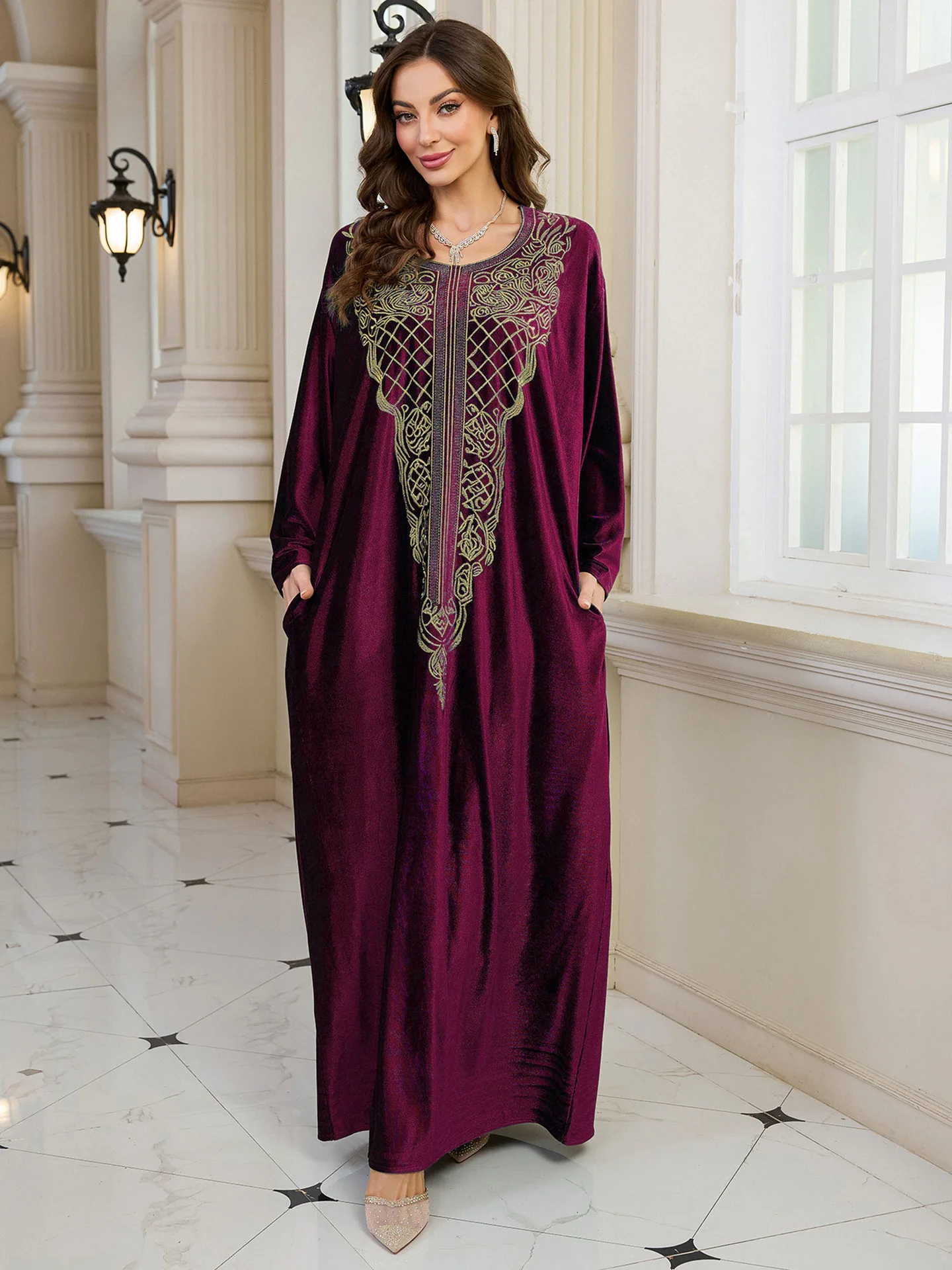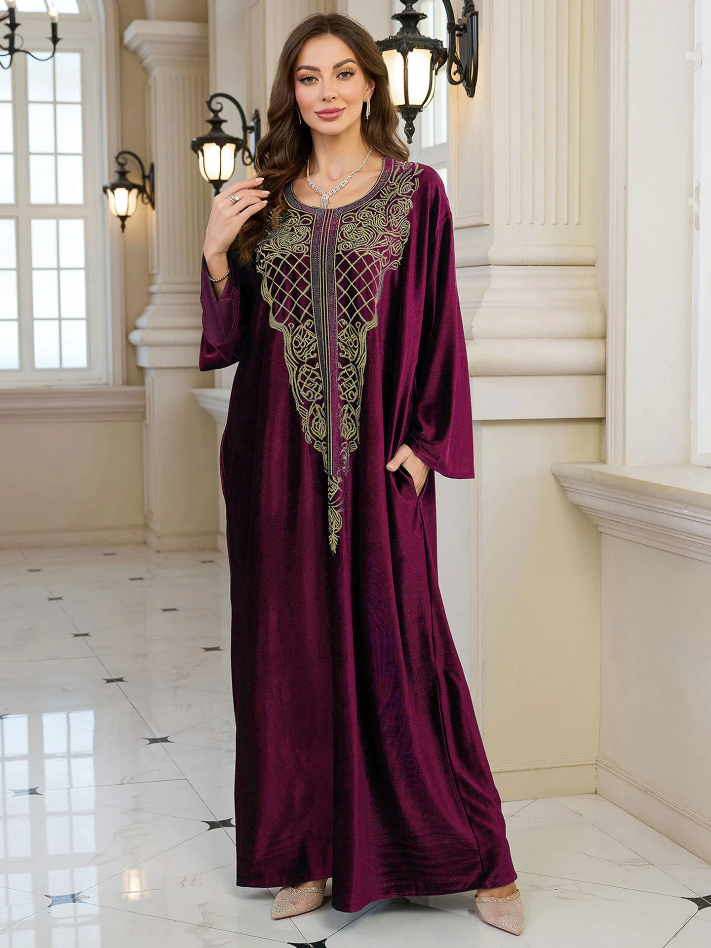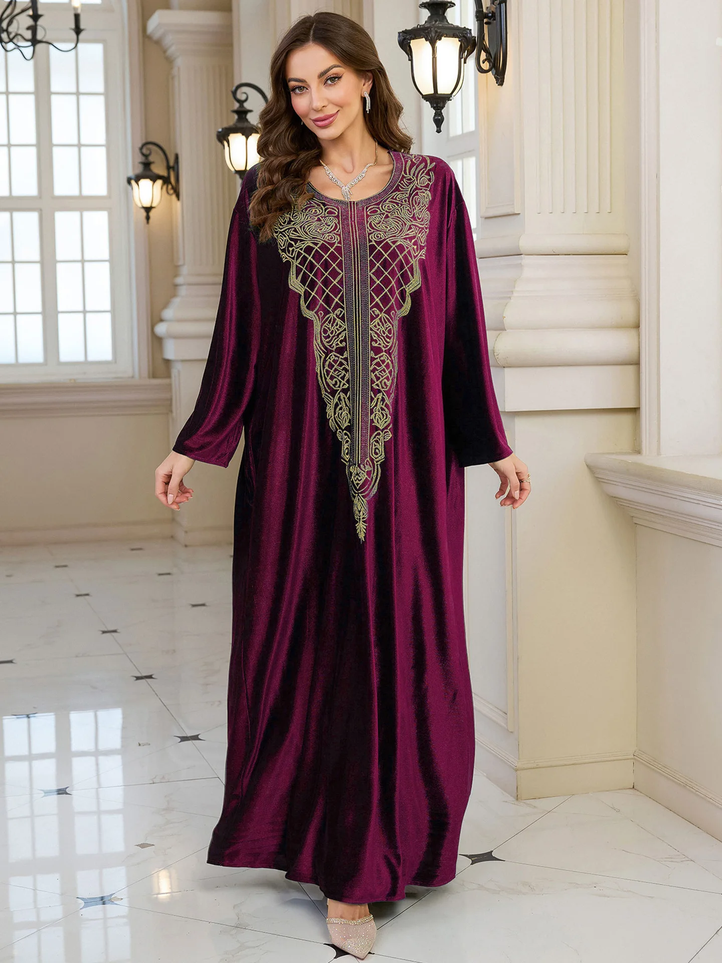 فستان قفطان مطرز فاخر للنساء، فستان جلابية فضفاض متواضع مع رقبة مطرزة يدويًا لعيد رمضان دبي السعودية
