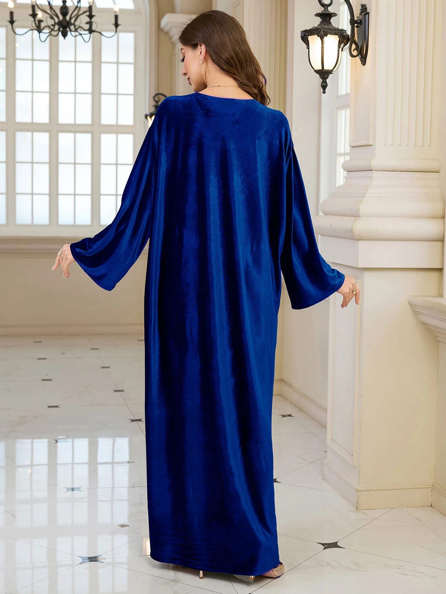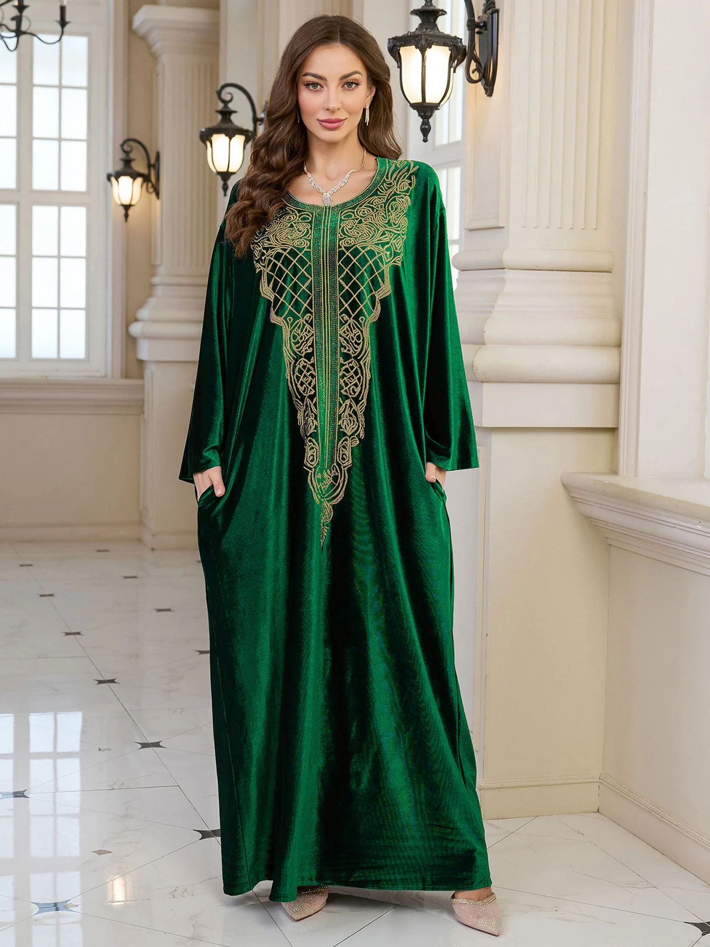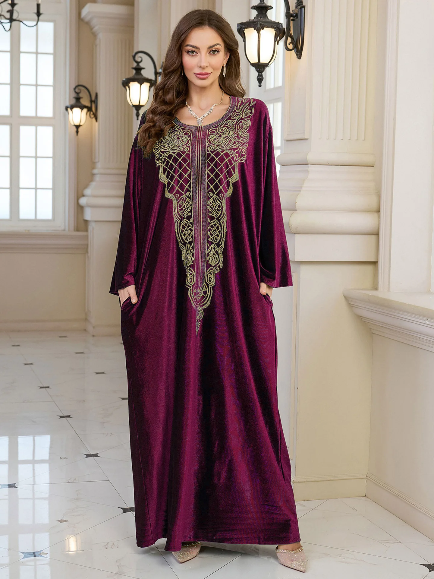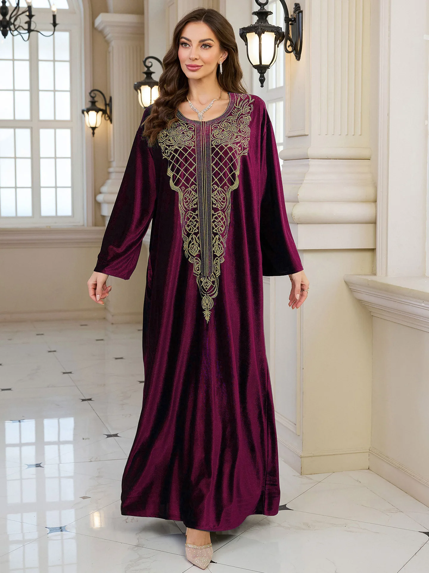 فستان قفطان مطرز فاخر للنساء، فستان جلابية فضفاض متواضع مع رقبة مطرزة يدويًا لعيد رمضان دبي السعودية