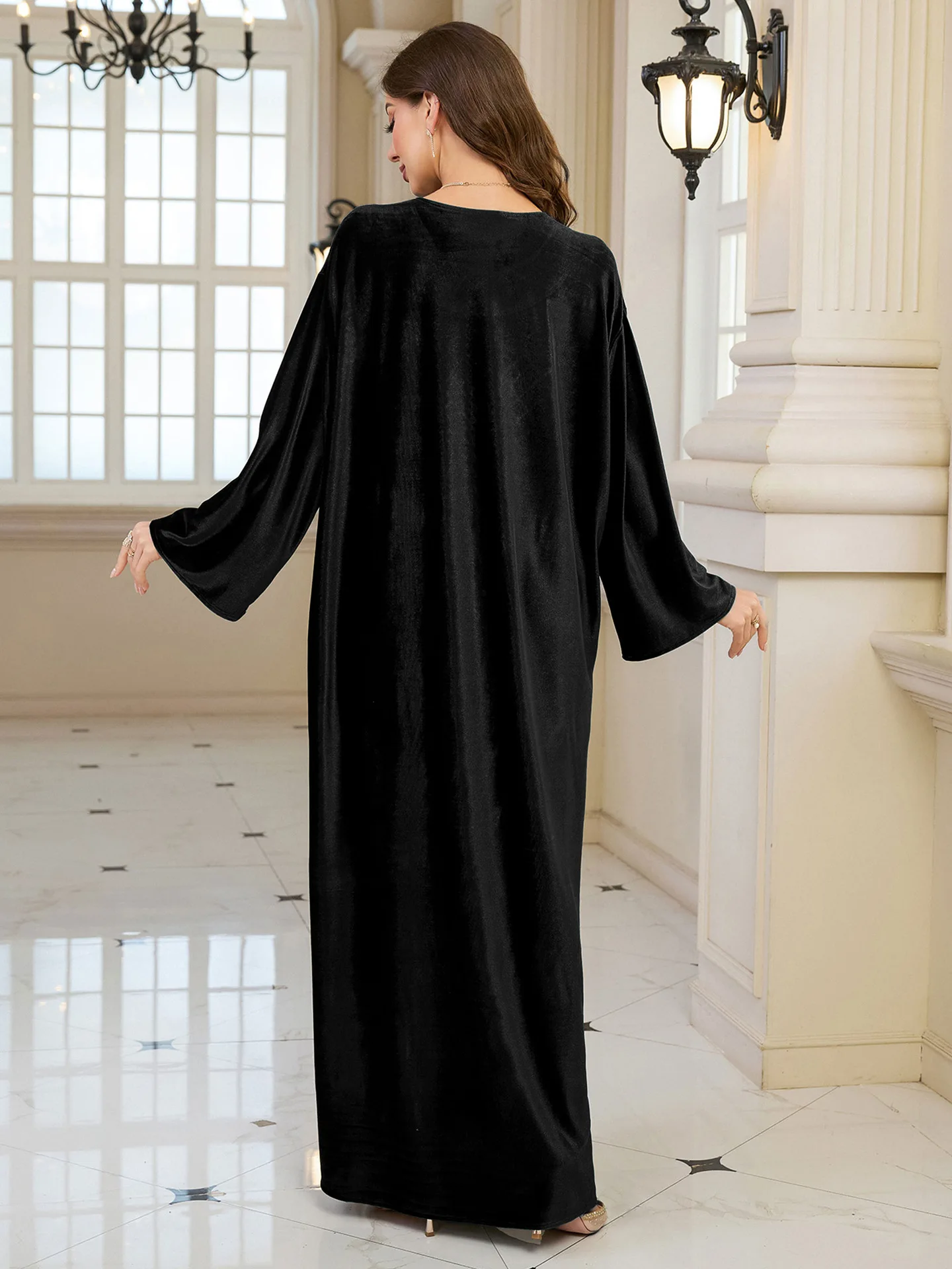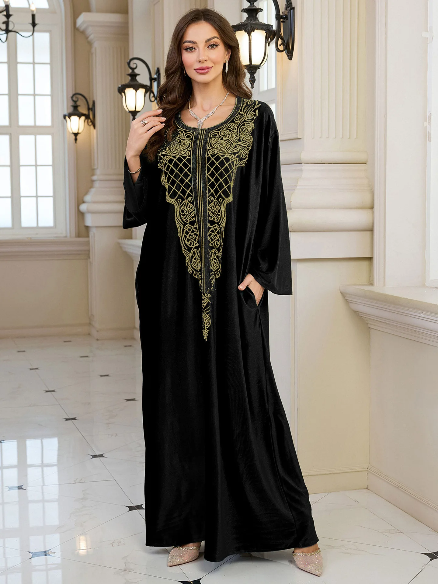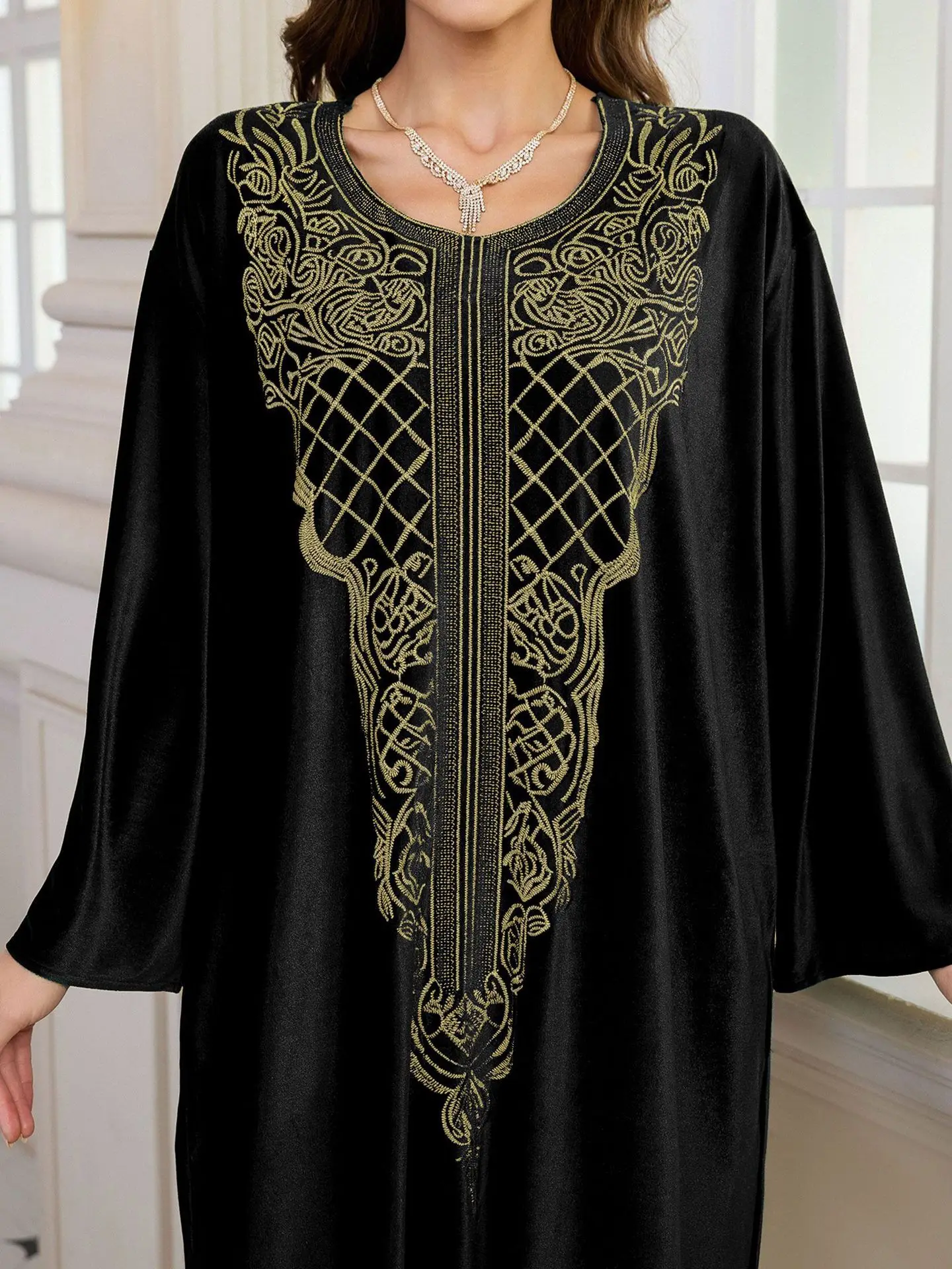 جلابية مطرزة باللون الأسود للنساء المسلمات مع تفاصيل ذهبية