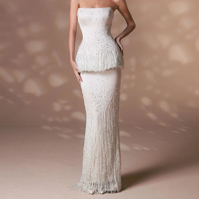 فستان سهرة فاخر بشرابة كريستال 2025 فساتين رسمية بدون حمالات للحفلات الراقصة بفتحة خلفية وأربطة من الخلف بدون أكمام للحفلات