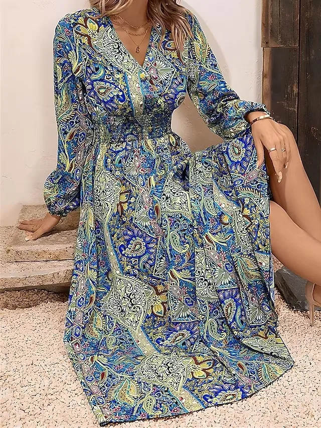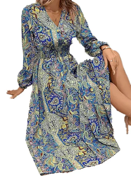 فساتين طويلة مطبوعة على الطراز البوهيمي للنساء برقبة على شكل حرف v وأكمام طويلة فستان أنيق للسيدات على شكل حرف a فستان شاطئ غير رسمي للخريف