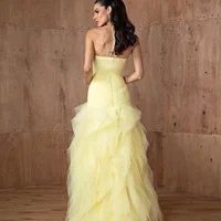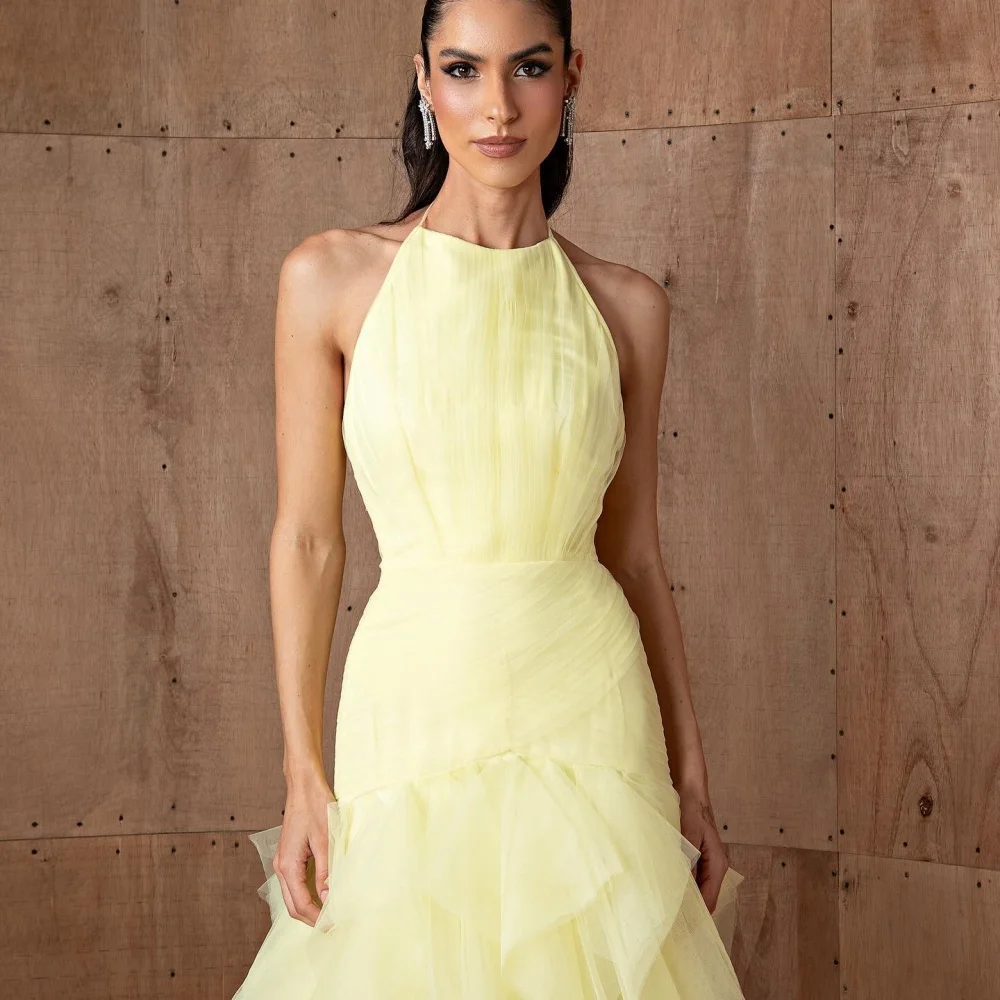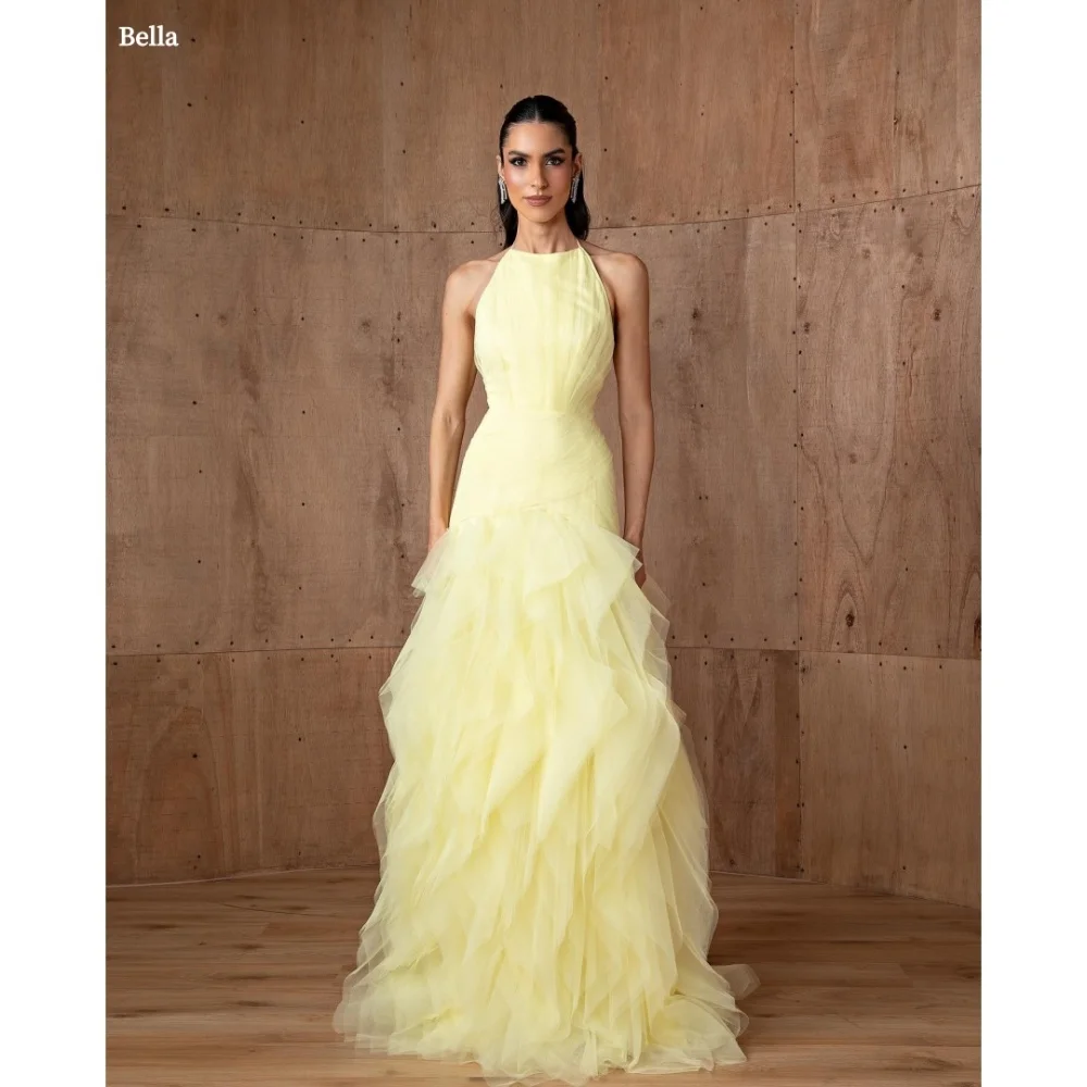 فستان بيلا مخصص برقبة رسن صفراء متعدد الطبقات من القماش الشبكي على شكل حرف a فساتين الحفلات بطول الأرض للحفلات الراقصة 2025