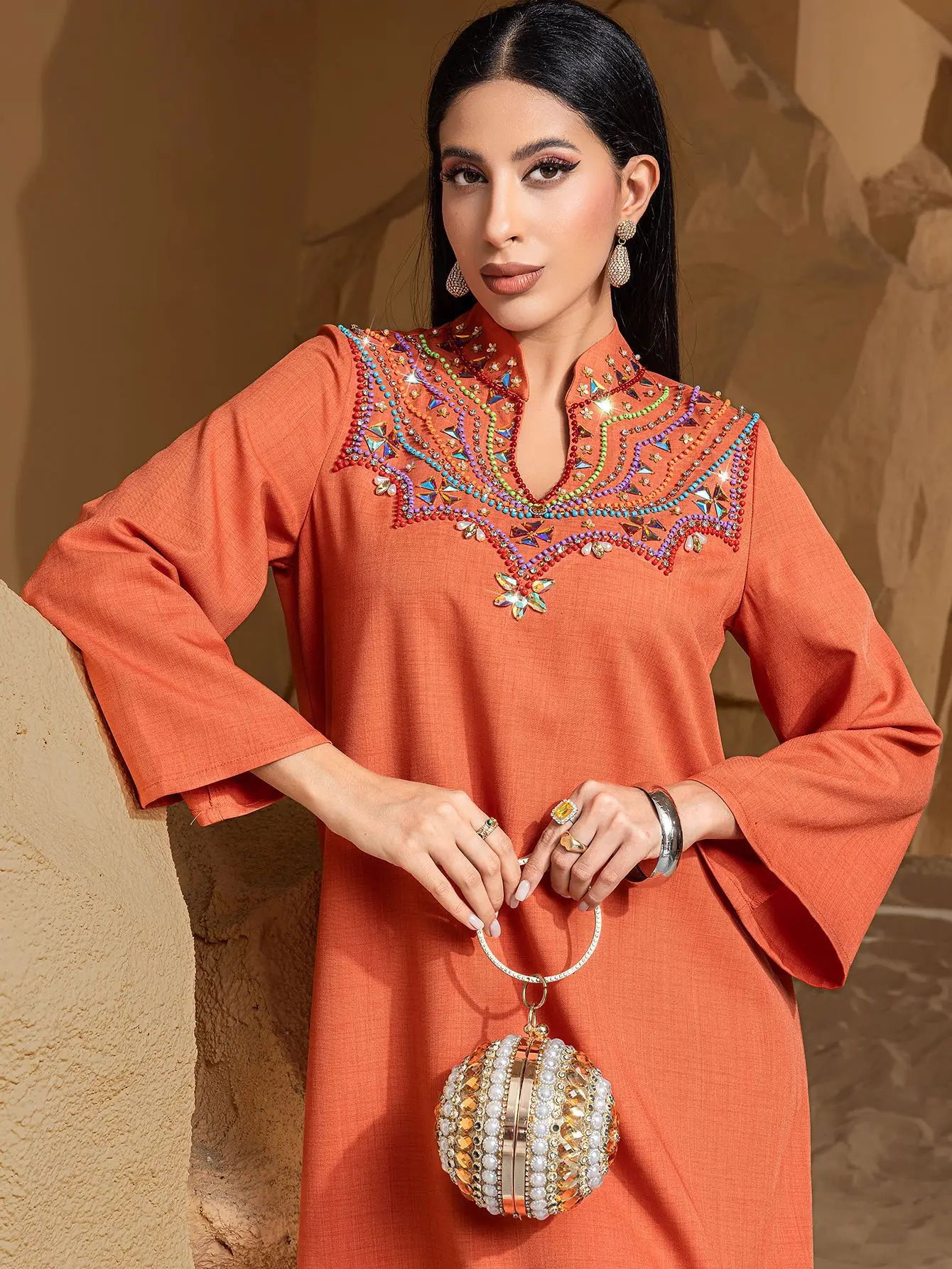 فستان قفطان مطرز فاخر للنساء، فستان جلابية فضفاض متواضع مع رقبة مطرزة يدويًا لعيد رمضان دبي السعودية