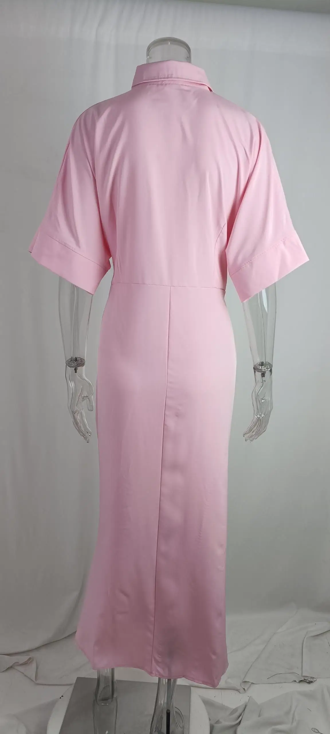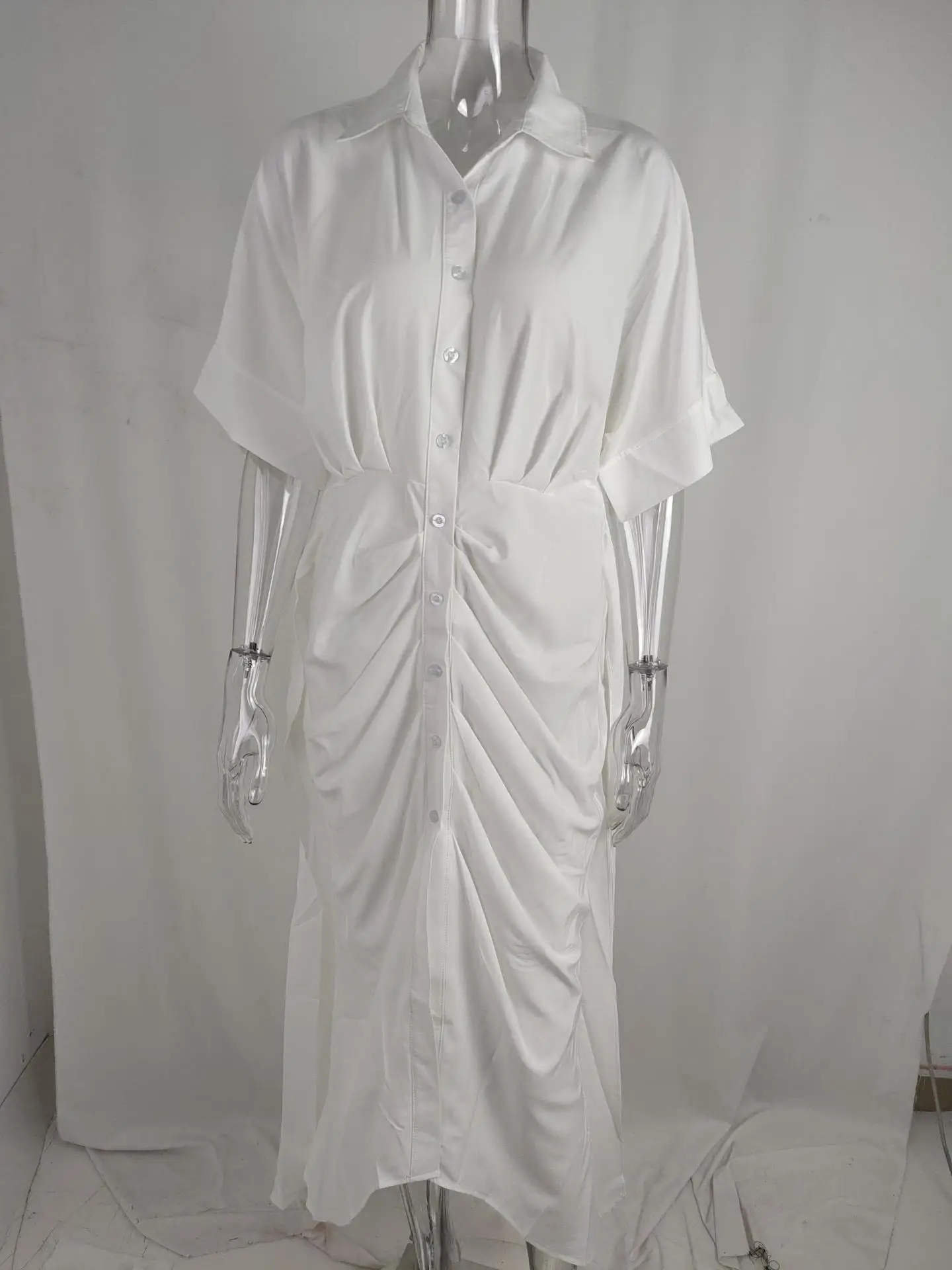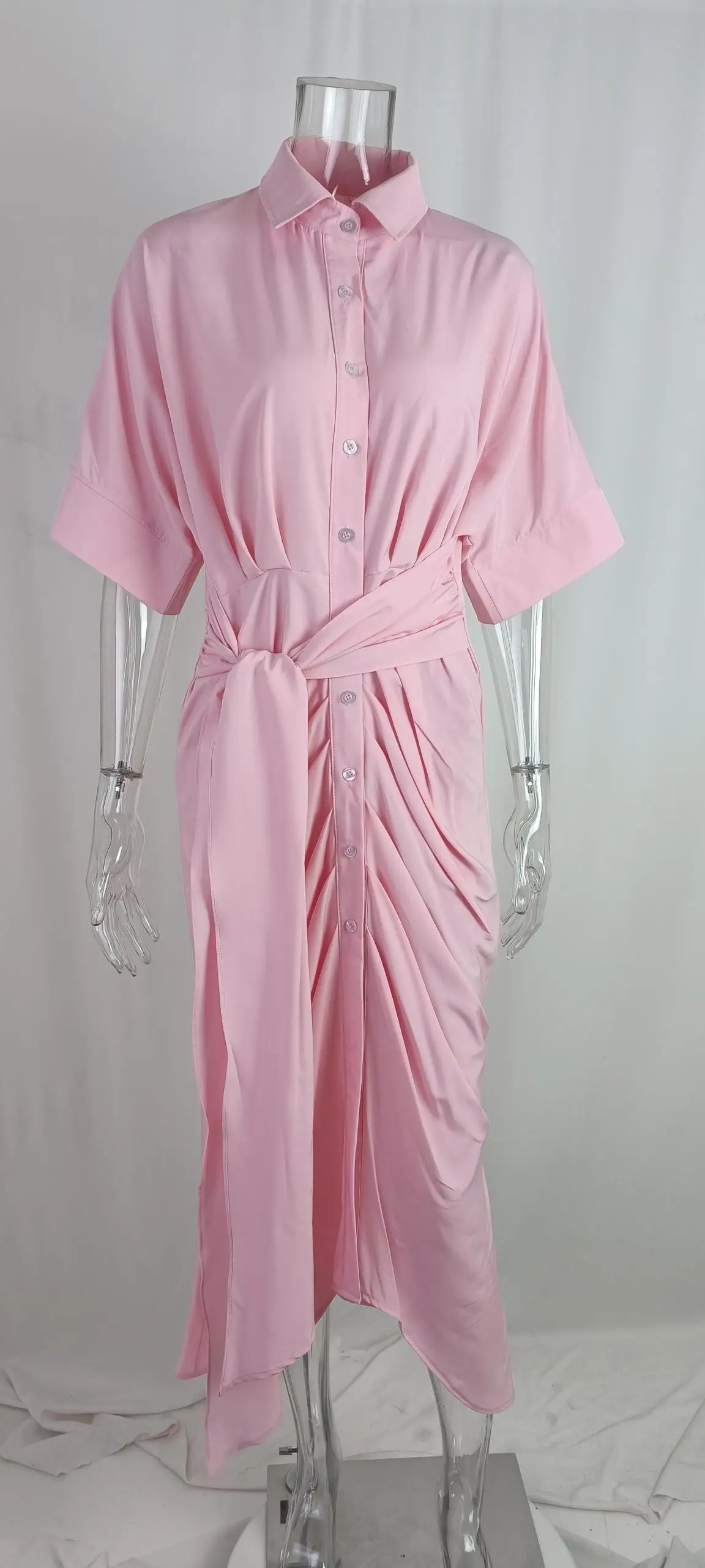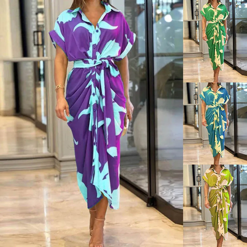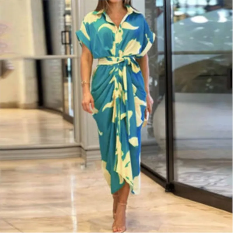 فستان قميص للسيدات عالي الخصر للنساء ملابس صيف 2025 فستان نسائي كلاسيكي غير رسمي ضيق بأكمام قصيرة تنورة طويلة متينة
