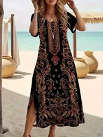 فستان نسائي بطبعة عرقية بوهيمية ، رقبة على شكل حرف V ، خصر مرن ، كاجوال ، كم على شكل خفاش ، فستان متوسط ، أنيق ، عتيق ، كلاسيكي