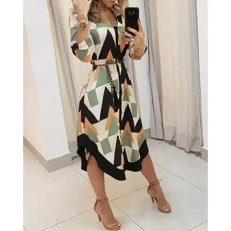 فستان نسائي بأكمام طويلة مطبوع بالشريط برباط ، فستان ركاب أنيق ، موضة طية صدر السترة ، حفلة عطلة غير رسمية ، الصيف