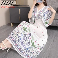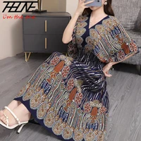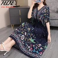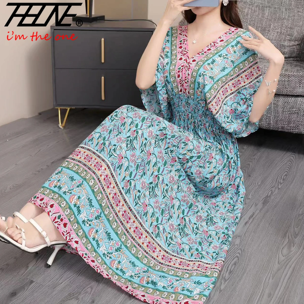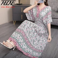 فستان نسائي بطبعة عرقية بوهيمية ، رقبة على شكل حرف V ، خصر مرن ، كاجوال ، كم على شكل خفاش ، فستان متوسط ، أنيق ، عتيق ، كلاسيكي