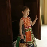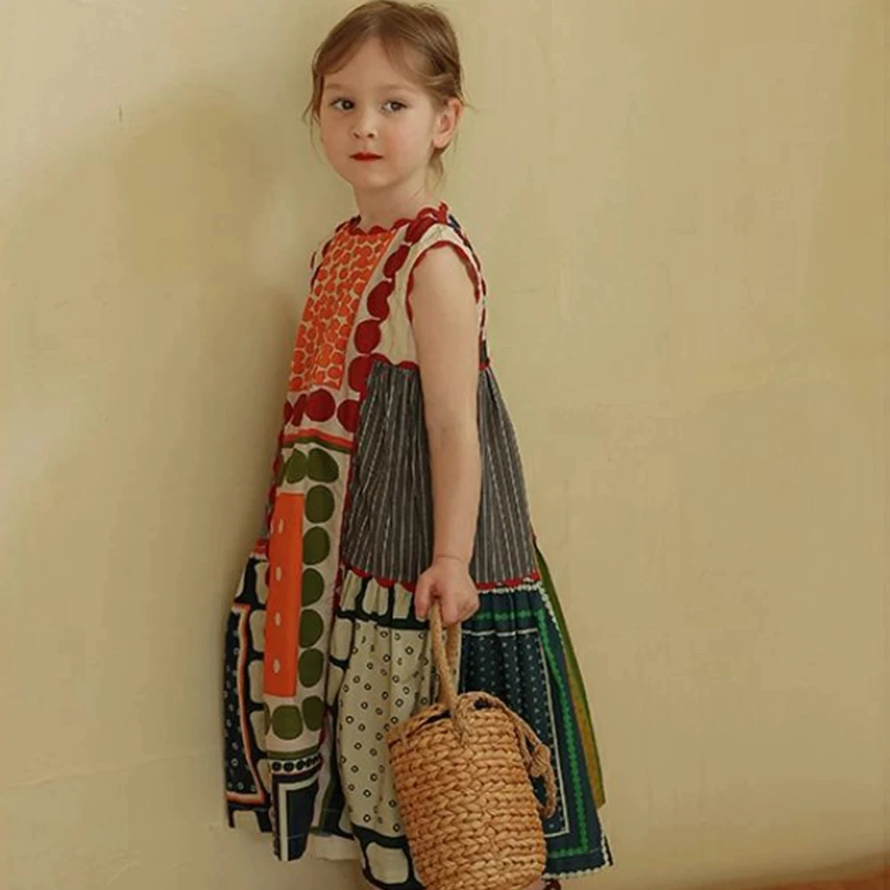 الفتيات الصيف الفرنسية خمر محبوك الخصر مقصوص تصميم طويل سترة دون أكمام فستان ملابس الأطفال لباس غير رسمي